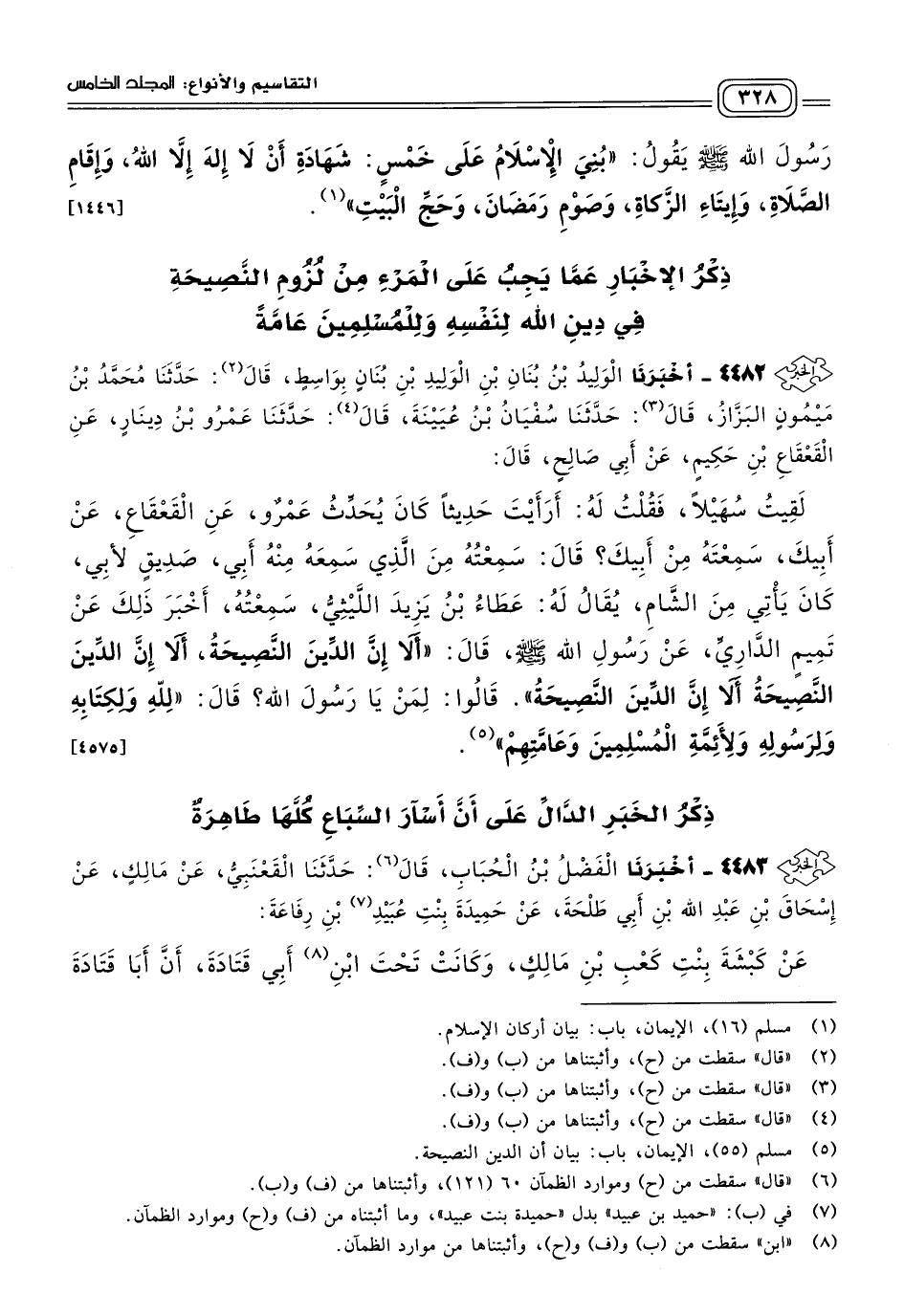 ٤٤٨٢ - أَخبَرنا الْوَلِيدُ بْنُ بُنَانِ بْنِ الْوَلِيدِ بْنِ بُنَانٍ، بِوَاسِطَ، قَالَ: حَدثنا مُحَمَّدُ بْنُ مَيْمُونٍ الْبَزَّازُ، قَالَ: حَدثنا سُفْيَانُ بْنُ عُيَيْنَةَ، قَالَ: حَدثنا عَمْرُو بْنُ دِينَارٍ، عَنِ الْقَعْقَاعِ بْنِ حَكِيمٍ، عَنْ أَبِي صَالِحٍ، قَالَ: لَقِيتُ سُهَيْلاً، فَقُلْتُ لَهُ: أَرَأَيْتَ حَدِيثًا كَانَ يُحَدِّثُ عَمْرٌو، عَنِ الْقَعْقَاعِ، عَنْ أَبِيكَ، سَمِعْتَهُ مِنْ أَبِيكَ؟ قَالَ سَمِعْتُهُ مِنَ الَّذِي سَمِعَهُ مِنْهُ أَبِي، صَدِيقٍ لأَبِي، كَانَ يَأْتِي مِنَ الشَّامِ، يُقَالُ لَهُ: عَطَاءُ بْنُ يَزِيدَ اللَّيْثِيُّ، سَمِعْتُهُ أَخْبَرَ ذَلِكَ، عَنْ تَمِيمٍ الدَّارِيِّ، عَنْ رَسُولِ اللهِ صَلى الله عَلَيه وسَلم قَالَ: "أَلَا إِنَّ الدِّينَ النَّصِيحَةُ، أَلَا إِنَّ الدِّينَ النَّصِيحَةُ، أَلَا إِنَّ الدِّينَ النَّصِيحَةُ"، قَالُوا: لِمَنْ يَا رَسُولَ اللهِ؟ قَالَ: "للهِ، وَلِكِتَابِهِ، وَلِرَسُولِهِ، وَلأَئِمَّةِ الْمُسْلِمِينَ، وَعَامَّتِهِمْ". [٤٥٧٥]