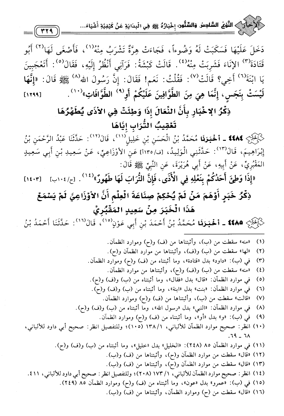 ٤٤٨٤ - أَخبَرنا مُحَمَّدُ بْنُ الْحَسَنِ بْنِ خَلِيلٍ، قَالَ: حَدثنا عَبْدُ الرَّحْمَنِ بْنُ إِبْرَاهِيمَ، قَالَ: حَدَّثَنِي الْوَلِيدُ، عَنِ الأَوْزَاعِيِّ، عَنْ سَعِيدِ بْنِ أَبِي سَعِيدٍ الْمَقْبُرِيِّ، عَنْ أَبِيهِ، عَنْ أَبِي هُرَيْرَةَ، عَنِ النَّبِيِّ صَلى الله عَلَيه وسَلم قَالَ: "إِذَا وَطِئَ أَحَدُكُمْ بِنَعْلِهِ فِي الأَذَى، فَإِنَّ التُّرَابَ لَهَا طَهُورٌ". [١٤٠٣]