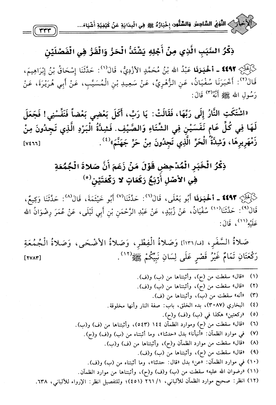 ٤٤٩٢ - أَخبَرنا عَبْدُ اللهِ بْنُ مُحَمَّدٍ الأَزْدِيُّ، قَالَ: حَدثنا إِسْحَاقُ بْنُ إِبْرَاهِيمَ، قَالَ: أَخبَرنا سُفْيَانُ، عَنِ الزُّهْرِيِّ، عَنْ سَعِيدِ بْنِ الْمُسَيَّبِ، عَنْ أَبِي هُرَيْرَةَ، عَنْ رَسُولِ اللهِ صَلى الله عَلَيه وسَلم أنه قَالَ: "اشْتَكَتِ النَّارُ إِلَى رَبِّهَا، فَقَالَتْ: يَا رَبِّ، أَكَلَ بَعْضِي بَعْضًا فَنَفِّسْنِي، فَجَعَلَ لَهَا فِي كُلِّ عَامٍ نَفَسَيْنِ فِي الشِّتَاءِ وَالصَّيْفِ، فَشِدَّةُ الْبَرْدِ الَّذِي تَجِدُونَ مِنْ زَمْهَرِيرِهَا، وَشِدَّةُ الْحَرِّ الَّذِي تَجِدُونَ مِنْ حَرِّ جَهَنَّمَ". [٧٤٦٦]
