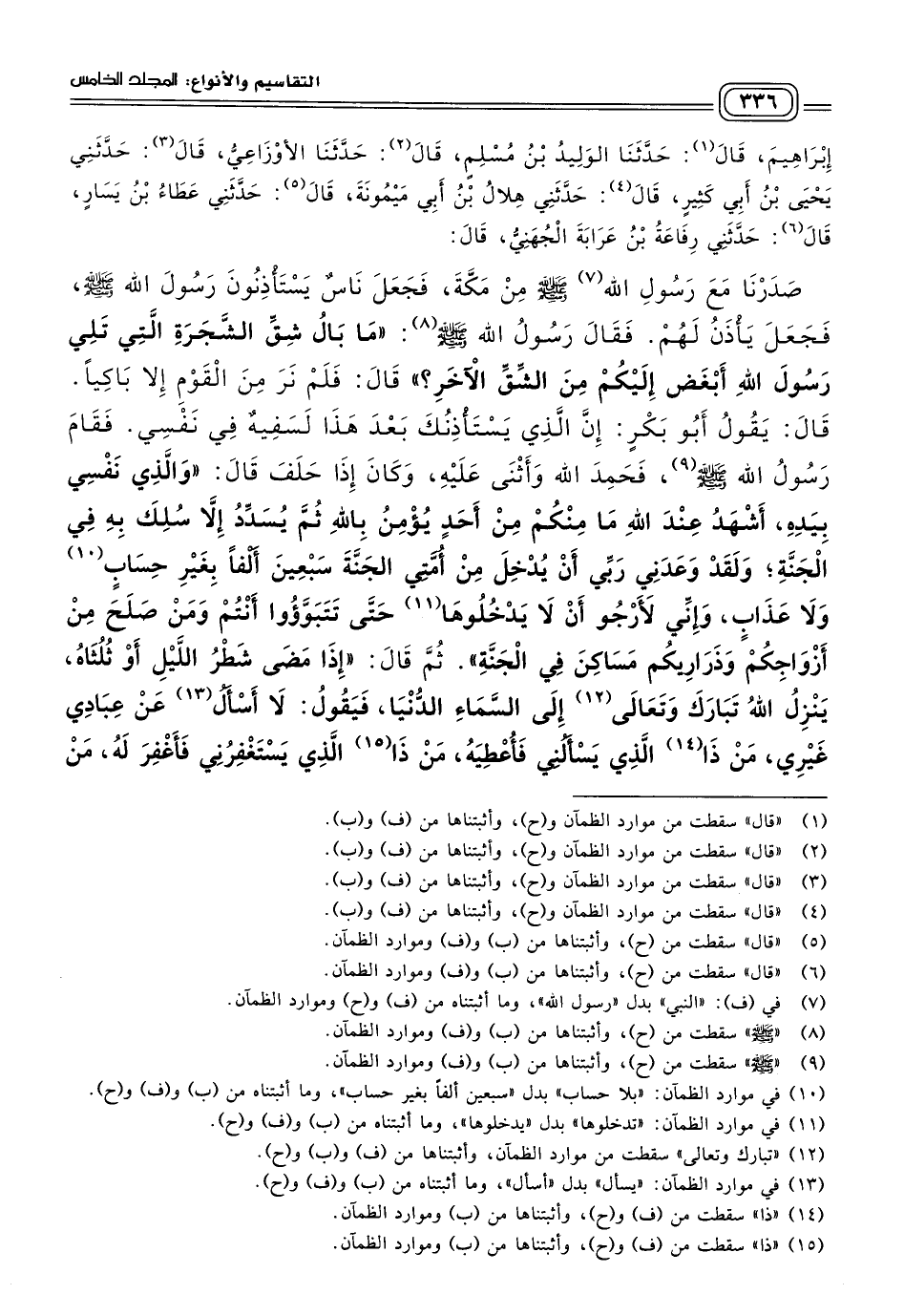قَالَ: يَقُولُ أَبُو بَكْرٍ: إِنَّ الَّذِي يَسْتَأْذِنُكَ بَعْدَ هَذَا لَسَفِيهٌ فِي نَفْسِي، فَقَامَ رَسُولُ اللهِ صَلى الله عَلَيه وسَلم، فَحَمِدَ اللهَ وَأَثْنَى عَلَيْهِ، وَكَانَ إِذَا حَلَفَ قَالَ: "وَالَّذِي نَفْسِي بِيَدِهِ، أَشْهَدُ عِنْدَ اللهِ مَا مِنْكُمْ مِنْ أَحَدٍ يُؤْمِنُ بِاللهِ ثُمَّ يُسَدِّدُ إِلَاّ سُلِكَ بِهِ فِي الْجَنَّةِ، وَلَقَدْ وَعَدَنِي رَبِّي أَنْ يُدْخِلَ مِنْ أُمَّتِي الْجَنَّةَ سَبْعِينَ أَلْفًا بِغَيْرِ حِسَابٍ وَلَا عَذَابٍ، وَإِنِّي لأَرْجُو أَنْ لَا يَدْخُلُوهَا حَتَّى تَتَبَوَّؤُوا أَنْتُمْ وَمَنْ صَلَحَ مِنْ أَزْوَاجِكُمْ وَذَرَارِيِّكُمْ مَسَاكِنَ فِي الْجَنَّةِ"، ثُمَّ قَالَ: "إِذَا مَضَى شَطْرُ اللَّيْلِ أَوْ ثُلُثَاهُ، يَنْزِلُ اللهُ تَبَارَكَ وَتَعَالَى إِلَى السَّمَاءِ الدُّنْيَا فَيَقُولُ: لَا أَسْأَلُ عَنْ عِبَادِي غَيْرِي، مَنْ ذَا الَّذِي يَسْأَلُنِي فَأُعْطِيَهُ، مَنْ ذَا الَّذِي يَسْتَغْفِرُنِي فَأَغْفِرَ لَهُ، مَنْ ذَا الَّذِي يَدْعُونِي فَأَسْتَجِيبَ لَهُ، حَتَّى يَنْفَجِرَ الصُّبْحُ". [٢١٢]