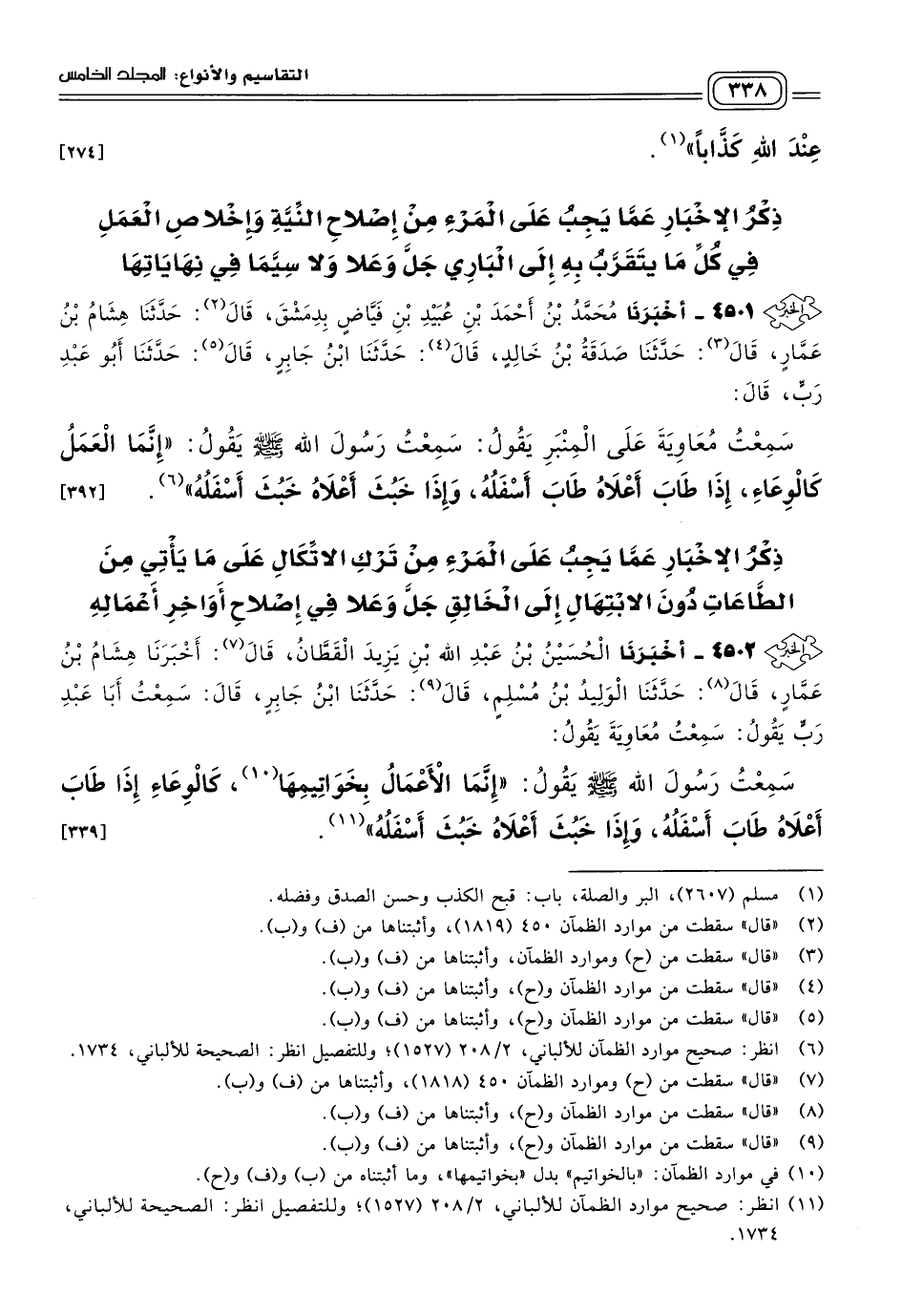 ٤٥٠٢ - أَخبَرنا الْحُسَيْنُ بْنُ عَبْدِ اللهِ بْنِ يَزِيدَ الْقَطَّانُ، قَالَ: أَخبَرنا هِشَامُ بْنُ عَمَّارٍ، قَالَ: حَدثنا الْوَلِيدُ بْنُ مُسْلِمٍ، قَالَ: حَدثنا ابْنُ جَابِرٍ، قَالَ: سَمِعْتُ أَبَا عَبْدِ رَبٍّ يَقُولُ: سَمِعْتُ مُعَاوِيَةَ يَقُولُ: سَمِعْتُ رَسُولَ اللهِ صَلى الله عَلَيه وسَلم يَقُولُ: "إِنَّمَا الأَعْمَالُ بِخَوَاتِيمِهَا، كَالْوِعَاءِ إِذَا طَابَ أَعْلَاهُ طَابَ أَسْفَلُهُ، وَإِذَا خَبُثَ أَعْلَاهُ خَبُثَ أَسْفَلُهُ". [٣٣٩]