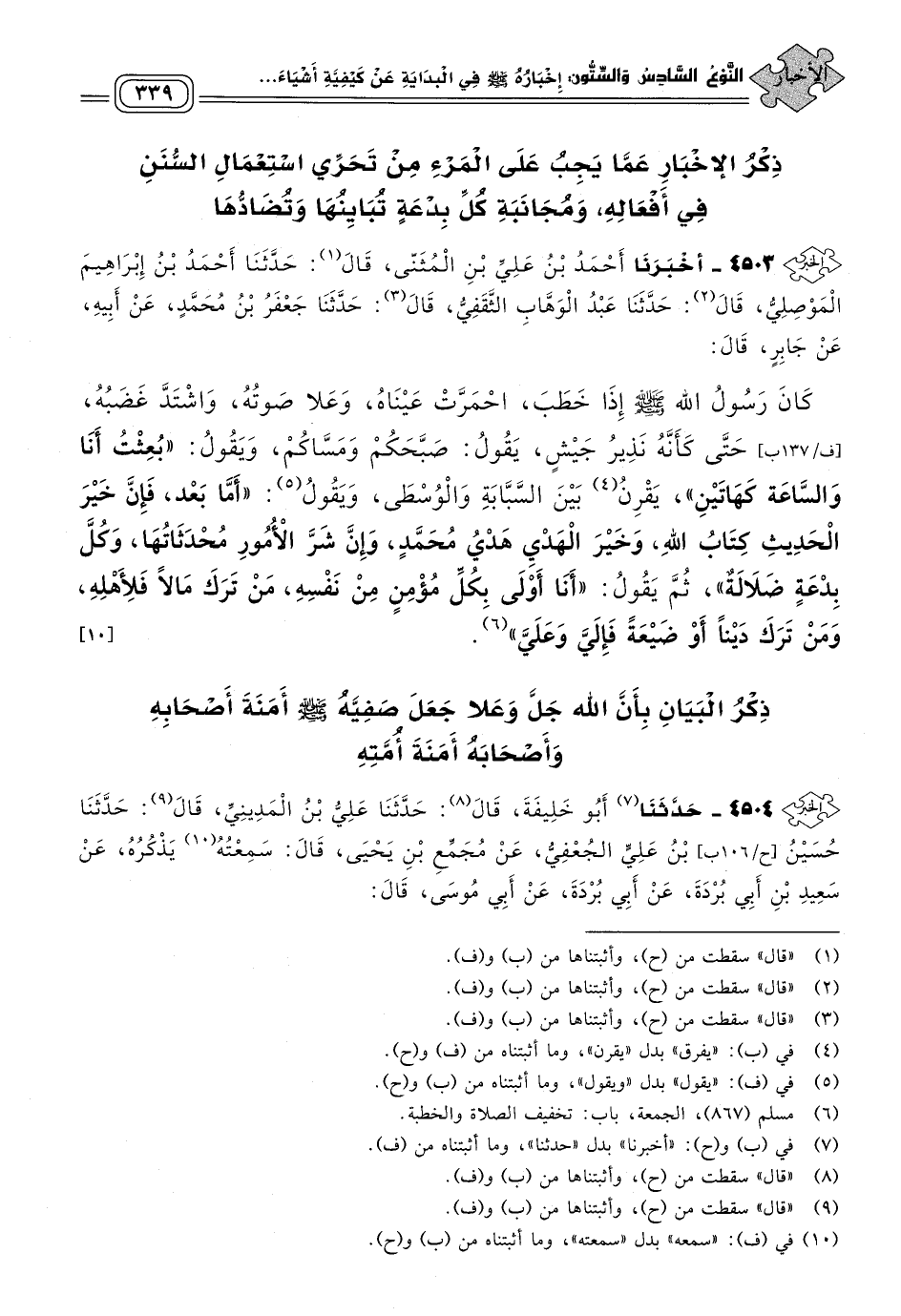 ٤٥٠٣ - أَخبَرنا أَحْمَدُ بْنُ عَلِيِّ بْنِ الْمُثَنَّى، قَالَ: حَدثنا أَحْمَدُ بْنُ إِبْرَاهِيمَ الْمَوْصِلِيُّ، قَالَ: حَدثنا عَبْدُ الْوَهَّابِ الثَّقَفِيُّ، قَالَ: حَدثنا جَعْفَرُ بْنُ مُحَمَّدٍ، عَنْ أَبِيهِ، عَنْ جَابِرٍ، قَالَ: كَانَ رَسُولُ اللهِ صَلى الله عَلَيه وسَلم إِذَا خَطَبَ احْمَرَّتْ عَيْنَاهُ، وَعَلَا صَوْتُهُ، وَاشْتَدَّ غَضَبُهُ، حَتَّى كَأَنَّهُ نَذِيرُ جَيْشٍ، يَقُولُ: صَبَّحَكُمْ وَمَسَّاكُمْ، وَيَقُولُ: "بُعِثْتُ أَنَا وَالسَّاعَةِ كَهَاتَيْنِ" يقرن بَيْنَ السَّبَّابَةِ وَالْوُسْطَى وَيَقُولُ: "أَمَّا بَعْدُ، فَإِنَّ خَيْرَ الْحَدِيثِ كِتَابُ اللهِ، وَخَيْرَ الْهَدْيِ هَدْيُ مُحَمَّدٍ، وَإِنَّ شَرَّ الأُمُورِ مُحْدَثَاتُهَا، وَكُلَّ بِدْعَةٍ ضَلَالَةٌ"، ثُمَّ يَقُولُ: "أَنَا أَوْلَى بِكُلِّ مُؤْمِنٍ مِنْ نَفْسِهِ، مَنْ تَرَكَ مَالاً فَلِأَهْلِهِ، وَمَنْ تَرَكَ دَيْنًا أَوْ ضَيْعَةً فَإِلَيَّ وَعَلَيَّ". [١٠]
