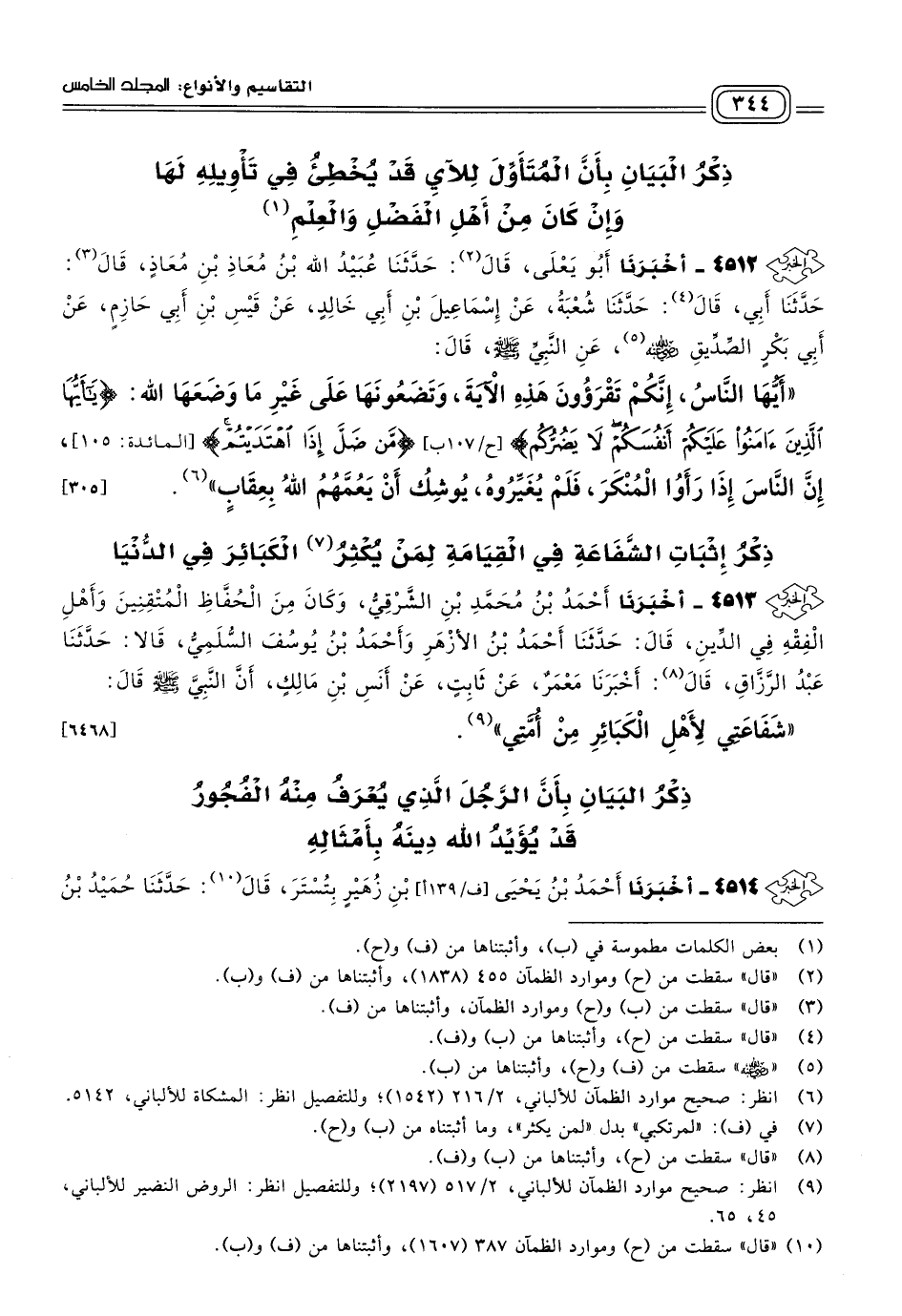 ٤٥١٢ - أَخبَرنا أَبُو يَعْلَى، قَالَ: حَدثنا عُبَيْدُ اللهِ بْنُ مُعَاذِ بْنِ مُعَاذٍ، قال: حَدثنا أَبِي، قَالَ: حَدثنا شُعْبَةُ، عَنْ إِسْمَاعِيلَ بْنِ أَبِي خَالِدٍ، عَنْ قَيْسِ بْنِ أَبِي حَازِمٍ، عَنْ أَبِي بَكْرٍ الصِّدِّيقِ رَضِيَ اللهُ عَنْهُ، عَنِ النَّبِيِّ صَلى الله عَلَيه وسَلم، قَالَ: "أَيُّهَا النَّاسُ، إِنَّكُمْ تَقْرَؤُونَ هَذِهِ الآيَةَ وَتَضَعُونَهَا عَلَى غَيْرِ مَا وَضَعَهَا اللهُ: {يَاأَيُّهَا الَّذِينَ آمَنُوا عَلَيْكُمْ أَنْفُسَكُمْ لَا يَضُرُّكُمْ مَنْ ضَلَّ إِذَا اهْتَدَيْتُمْ} [المائدة: ١٠٥]، إِنَّ النَّاسَ إِذَا رَأَوُا الْمُنْكَرَ فَلَمْ يُغَيِّرُوهُ، يُوشِكُ أَنْ يَعُمَّهُمُ اللهُ بِعِقَابٍ". [٣٠٥]