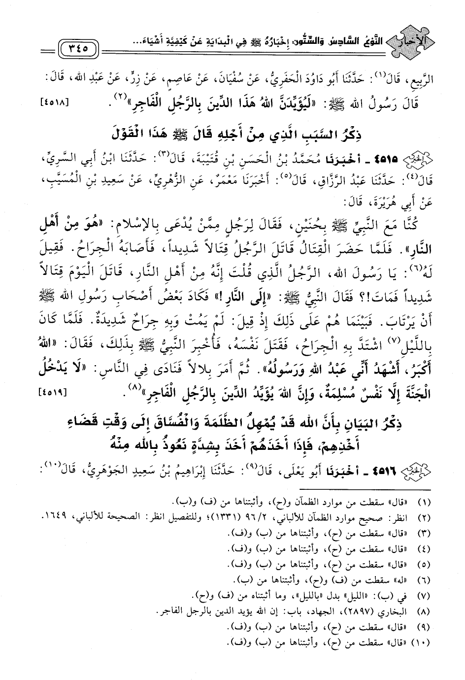 ٤٥١٥ - أَخبَرنا مُحَمَّدُ بْنُ الْحَسَنِ بْنِ قُتَيْبَةَ، قَالَ: حَدثنا ابْنُ أَبِي السَّرِيِّ، قَالَ: حَدثنا عَبْدُ الرَّزَّاقِ، قَالَ: أَخبَرنا مَعْمَرٌ، عَنِ الزُّهْرِيِّ، عَنْ سَعِيدِ بْنِ الْمُسَيَّبِ، عَنْ أَبِي هُرَيْرَةَ قَالَ: كُنَّا مَعَ النَّبِيِّ صَلى الله عَلَيه وسَلم بِحُنَيْنٍ، فَقَالَ لِرَجُلٍ مِمَّنْ يُدْعَى بِالإِسْلَامِ: "هُوَ مِنْ أَهْلِ النَّارِ"، فَلَمَّا حَضَرَ الْقِتَالَ قَاتَلَ الرَّجُلُ قِتَالاً شَدِيدًا فَأَصَابَهُ الْجِرَاحُ، فَقِيلَ لَهُ: يَا رَسُولَ اللهِ، الرَّجُلُ الَّذِي قُلْتَ إِنَّهُ مِنْ أَهْلِ النَّارِ، قَاتَلَ الْيَوْمَ قِتَالاً شَدِيدًا فَمَاتَ، فَقَالَ النَّبِيُّ صَلى الله عَلَيه وسَلم: "إِلَى النَّارِ"، فَكَادَ بَعْضُ أَصْحَابِ رَسُولِ اللهِ صَلى الله عَلَيه وسَلم أَنْ يَرْتَابَ، فَبَيْنَمَا هُمْ عَلَى ذَلِكَ إِذْ قِيلَ: لَمْ يَمُتْ وَبِهِ جِرَاحٌ شَدِيدَةٌ، فَلَمَّا كَانَ بِاللَّيْلِ اشْتَدَّ بِهِ الْجِرَاحُ، فَقَتَلَ نَفْسَهُ، فَأُخْبِرَ النَّبِيُّ صَلى الله عَلَيه وسَلم بِذَلِكَ، فَقَالَ: "اللهُ أَكْبَرُ، أَشْهَدُ أَنِّي عَبْدُ اللهِ وَرَسُولُهُ"، ثُمَّ أَمَرَ بِلَالاً فَنَادَى فِي النَّاسِ: "لَا يَدْخُلُ الْجَنَّةَ إِلَاّ نَفْسٌ مُسْلِمَةٌ، وَإِنَّ اللهَ يُؤَيِّدُ الدِّينَ بِالرَّجُلِ الْفَاجِرِ". [٤٥١٩]