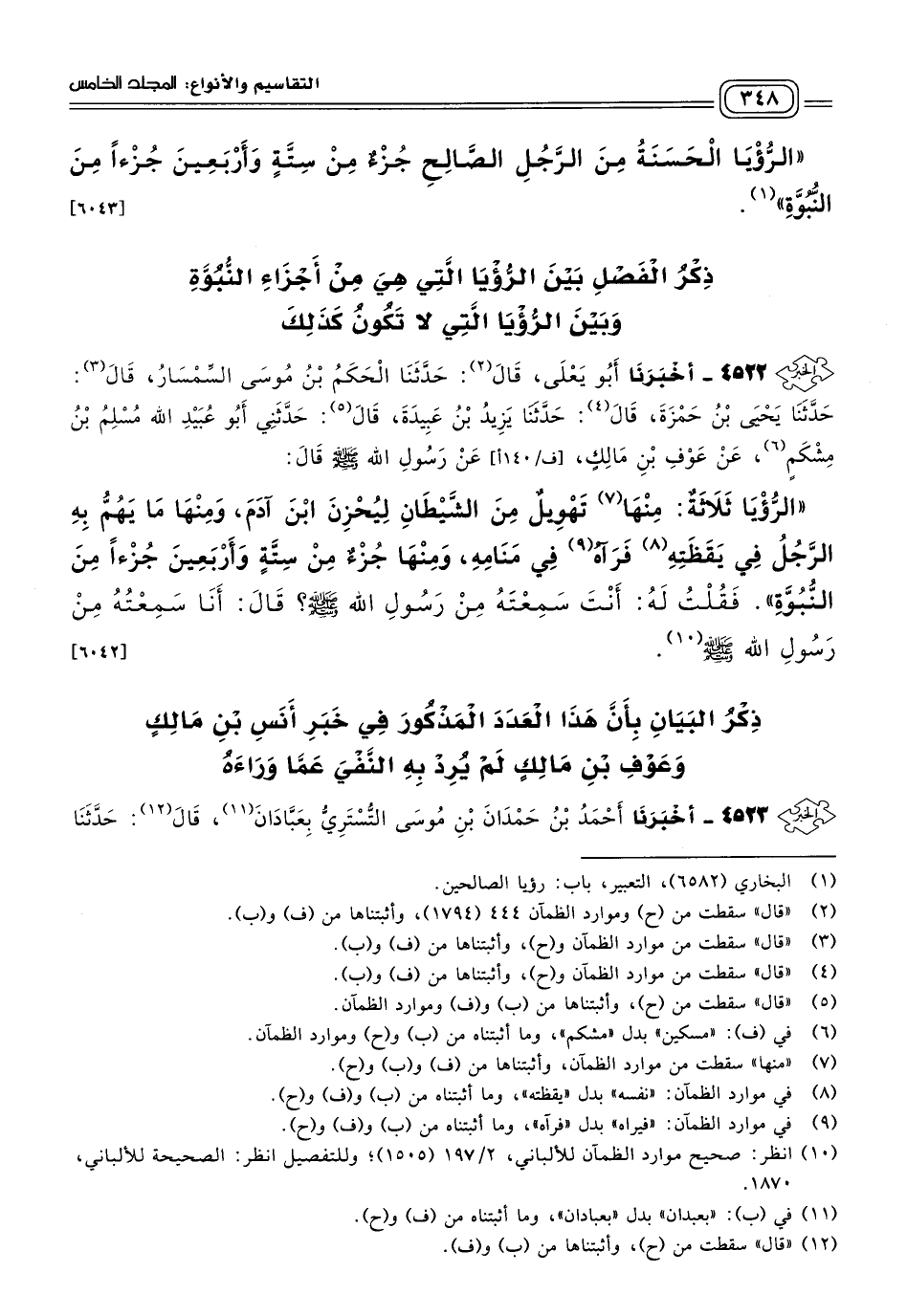 ٤٥٢٢ - أَخبَرنا أَبُو يَعْلَى، قَالَ: حَدثنا الْحَكَمُ بْنُ مُوسَى السِّمْسَارُ، قَالَ: حَدثنا يَحْيَى بْنُ حَمْزَةَ، قَالَ: حَدثنا يَزِيدُ بْنُ عُبَيْدَةَ، قَالَ: حَدَّثَنِي أَبُو عُبَيْدِ اللهِ مُسْلِمُ بْنُ مِشْكَمٍ، عَنْ عَوْفِ بْنِ مَالِكٍ، عَنْ رَسُولِ اللهِ صَلى الله عَلَيه وسَلم قَالَ: "الرُّؤْيَا ثَلَاثَةٌ: مِنْهَا تَهْوِيلٌ مِنَ الشَّيْطَانِ لِيُحْزِنَ ابْنَ آدَمَ، وَمِنْهَا مَا يَهُمُّ بِهِ الرَّجُلُ فِي يَقَظَتِهِ فَرَآهُ فِي مَنَامِهِ، وَمِنْهَا جُزْءٌ مِنْ سِتَّةٍ وَأَرْبَعِينَ جُزْءًا مِنَ النُّبُوَّةِ"، فَقُلْتُ لَهُ: أَنْتَ سَمِعْتَهُ مِنْ رَسُولِ اللهِ صَلى الله عَلَيه وسَلم؟ قَالَ: أَنَا سَمِعْتُهُ مِنْ رَسُولِ اللهِ صَلى الله عَلَيه وسَلم. [٦٠٤٢]