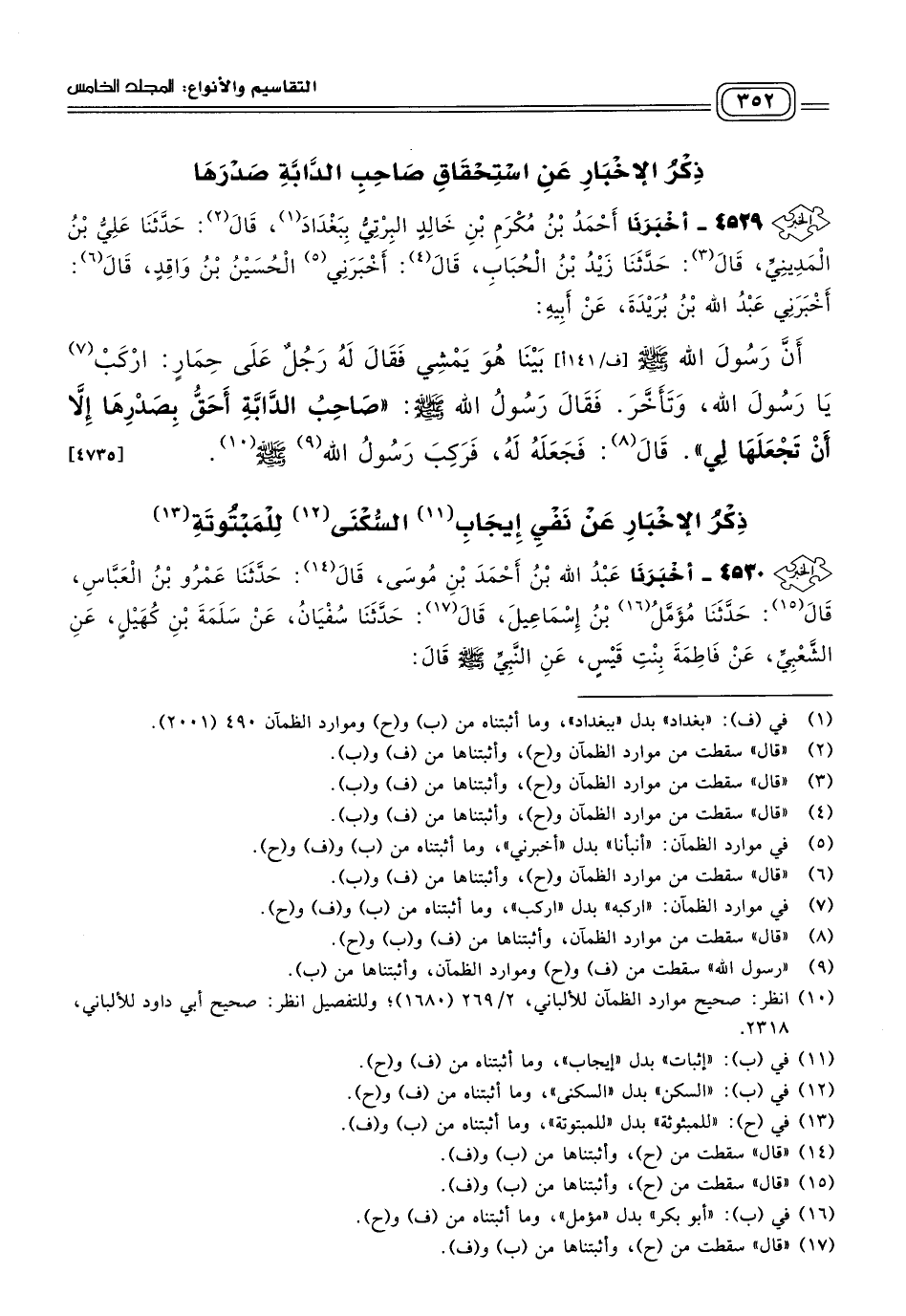٤٥٢٩ - أَخبَرنا أَحْمَدُ بْنُ مُكْرَمِ بْنِ خَالِدٍ الْبِرْتِيُّ، بِبَغْدَادَ، قَالَ: حَدثنا عَلِيُّ بْنُ الْمَدِينِيِّ، قَالَ: حَدثنا زَيْدُ بْنُ الْحُبَابِ، قَالَ: أَخْبَرَنِي الْحُسَيْنُ بْنُ وَاقِدٍ، قَالَ: أَخْبَرَنِي عَبْدُ اللهِ بْنُ بُرَيْدَةَ، عَنْ أَبِيهِ، أَنَّ رَسُولَ اللهِ صَلى الله عَلَيه وسَلم بَيْنَا هُوَ يَمْشِي فَقَالَ لَهُ رَجُلٌ عَلَى حِمَارٍ: ارْكَبْ يَا رَسُولَ اللهِ، وَتَأَخَّرَ، فَقَالَ رَسُولُ اللهِ صَلى الله عَلَيه وسَلم: "صَاحِبُ الدَّابَّةِ أَحَقُّ بِصَدْرِهَا إِلَاّ أَنْ تَجْعَلَهَا لِي"، قَالَ: فَجَعَلَهُ لَهُ، فَرَكِبَ رَسُولُ اللهِ صَلى الله عَلَيه وسَلم. [٤٧٣٥]