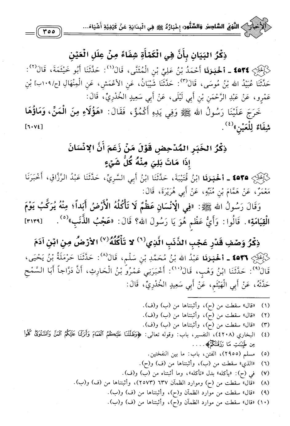 ٤٥٣٥ - أَخبَرنا ابْنُ قُتَيْبَةَ، حَدثنا ابْنُ أَبِي السَّرِيِّ، حَدثنا عَبْدُ الرَّزَّاقِ، أَخبَرنا مَعْمَرٌ، عَنْ هَمَّامِ بْنِ مُنَبِّهٍ، عَنْ أَبِي هُرَيْرَةَ، قَالَ: وَقَالَ رَسُولُ اللهِ صَلى الله عَلَيه وسَلم: "فِي الإِنْسَانِ عَظْمٌ لَا تَأْكُلُهُ الأَرْضُ أَبَدًا، مِنْهُ يُرَكَّبُ يَوْمَ الْقِيَامَةِ"، قَالُوا: وَأَيُّ عَظْمٍ هُوَ يَا رَسُولَ اللهِ؟ قَالَ: "عَجْبُ الذَّنَبِ". [٣١٣٩]
