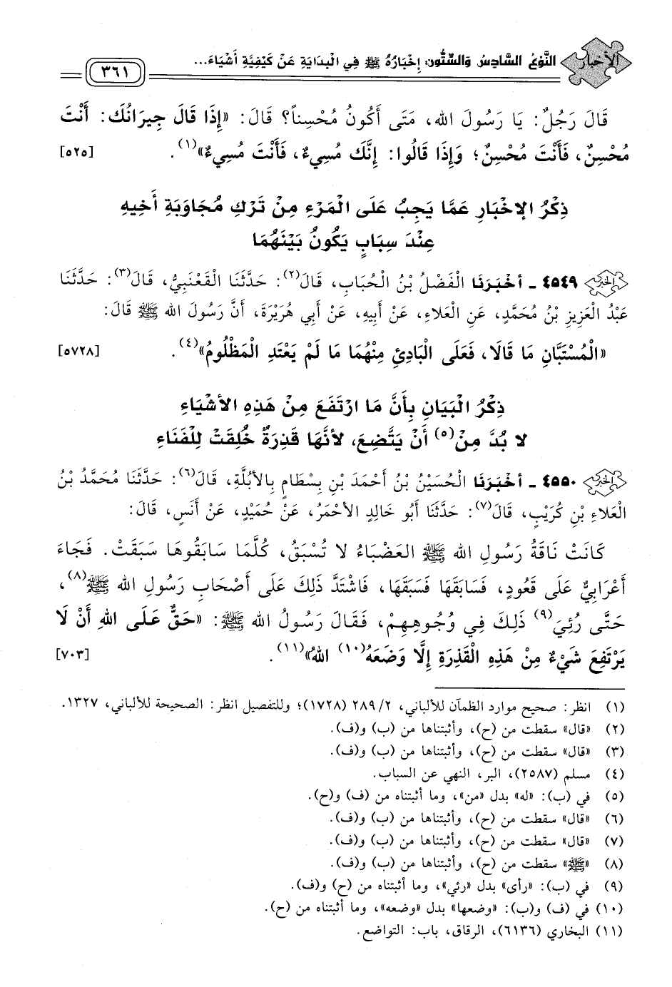 ٤٥٤٩ - أَخبَرنا الْفَضْلُ بْنُ الْحُبَابِ، قَالَ: حَدثنا الْقَعْنَبِيُّ، قَالَ: حَدثنا عَبْدُ الْعَزِيزِ بْنُ مُحَمَّدٍ، عَنِ الْعَلَاءِ، عَنْ أَبِيهِ، عَنْ أَبِي هُرَيْرَةَ، أَنَّ رَسُولَ اللهِ صَلى الله عَلَيه وسَلم قَالَ: "الْمُسْتَبَّانِ مَا قَالَا، فَعَلَى الْبَادِئِ مِنْهُمَا مَا لَمْ يَعْتَدِ الْمَظْلُومُ". [٥٧٢٨]