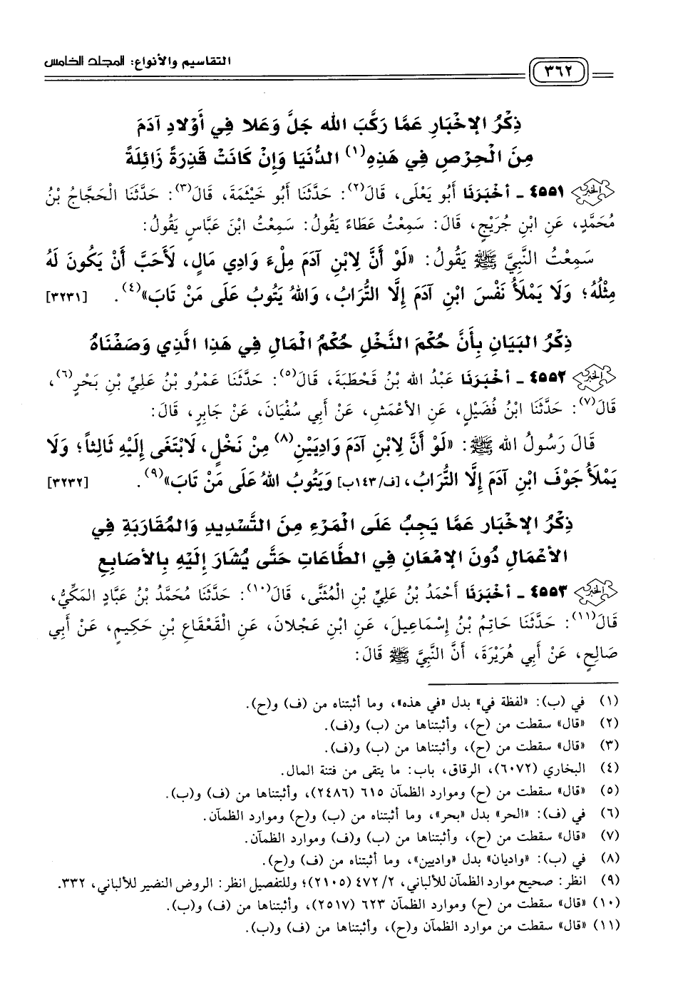 ٤٥٥١ - أَخبَرنا أَبُو يَعْلَى، قَالَ: حَدثنا أَبُو خَيْثَمَةَ، قَالَ حَدثنا الْحَجَّاجُ بْنُ مُحَمَّدٍ، عَنِ ابْنِ جُرَيْجٍ، قَالَ: سَمِعْتُ عَطَاءً يَقُولُ: سَمِعْتُ ابْنَ عَبَّاسٍ يَقُولُ: سَمِعْتُ النَّبِيَّ صَلى الله عَلَيه وسَلم يَقُولُ: "لَوْ أَنَّ لاِبْنِ آدَمَ مِلْءَ وَادِي مَالٍ لأَحَبَّ أَنْ يَكُونَ لَهُ مِثْلُهُ، وَلَا يَمْلأُ نَفْسَ ابْنِ آدَمَ إِلَاّ التُّرَابُ، وَاللهُ يَتُوبُ عَلَى مَنْ تَابَ". [٣٢٣١]