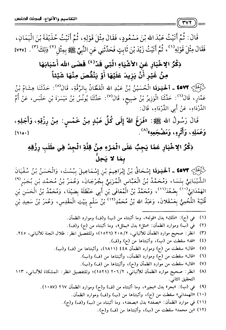 ٤٥٧٢ - أَخبَرنا الْحُسَيْنُ بْنُ عَبْدِ اللهِ الْقَطَّانُ بِالرَّقَّةِ، قَالَ: حَدثنا هِشَامُ بْنُ عَمَّارٍ، قَالَ: حَدثنا الْوَزِيرُ بْنُ صُبَيْحٍ، قَالَ: حَدثنا يُونُسُ بْنُ مَيْسَرَةَ بْنِ حَلْبَسٍ، عَنْ أُمِّ الدَّرْدَاءِ، عَنْ أَبِي الدَّرْدَاءِ، قَالَ: قَالَ رَسُولُ اللهِ صَلى الله عَلَيه وسَلم: "فَرَغَ اللهُ إِلَى كُلِّ عَبْدٍ مِنْ خَمْسٍ: مِنْ رِزْقِهِ وَأَجَلِهِ وَعَمَلِهِ وَأَثَرِهِ وَمَضْجَعِهِ". [٦١٥٠]