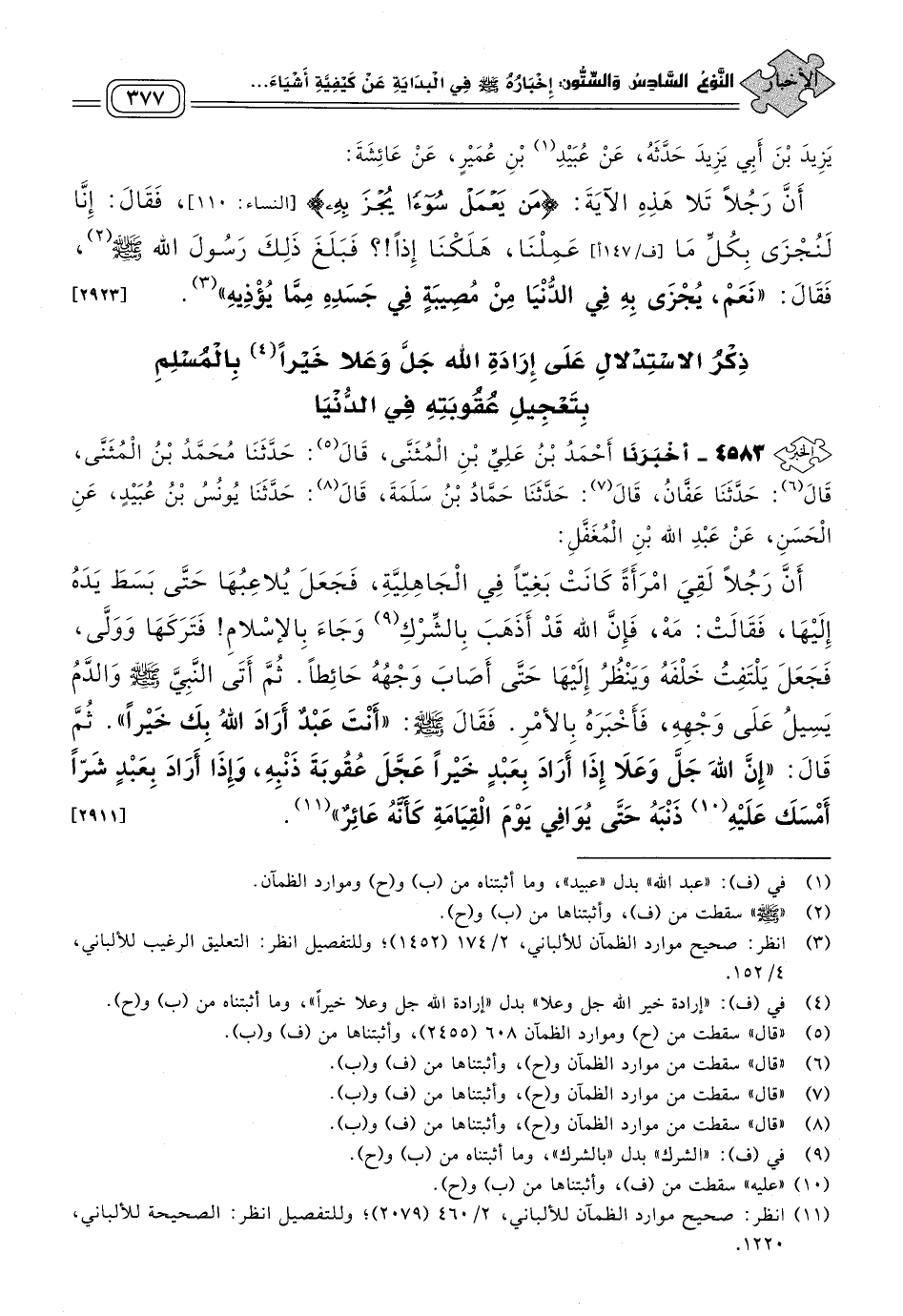 ٤٥٨٣ - أَخبَرنا أَحْمَدُ بْنُ عَلِيِّ بْنِ الْمُثَنَّى، قَالَ: حَدثنا مُحَمَّدُ بْنُ الْمُثَنَّى، قَالَ: حَدثنا عَفَّانُ، قَالَ: حَدثنا حَمَّادُ بْنُ سَلَمَةَ، قَالَ: حَدثنا يُونُسُ بْنُ عُبَيْدٍ، عَنِ الْحَسَنِ، عَنْ عَبْدِ اللهِ بْنِ الْمُغَفَّلِ، أَنَّ رَجُلاً لَقِيَ امْرَأَةَ كَانَتْ بَغِيًّا فِي الْجَاهِلِيَّةِ، فَجَعَلَ يُلَاعِبُهَا حَتَّى بَسَطَ يَدَهُ إِلَيْهَا، فَقَالَتْ: مَهْ، فَإِنَّ اللهَ قَدْ أَذْهَبَ بِالشِّرْكِ وَجَاءَ بِالإِسْلَامِ، فَتَرَكَهَا وَوَلَّى، فَجَعَلَ يَلْتَفِتُ خَلْفَهُ وَيَنْظُرُ إِلَيْهَا حَتَّى أَصَابَ وَجْهُهُ حَائِطًا، ثُمَّ أَتَى النَّبِيَّ صَلى الله عَلَيه وسَلم وَالدَّمُ يَسِيلُ عَلَى وَجْهِهِ، فَأَخْبَرَهُ بِالأَمْرِ، فَقَالَ صَلى الله عَلَيه وسَلم: "أَنْتَ عَبْدٌ أَرَادَ اللهُ بِكَ خَيْرًا"، ثُمَّ قَالَ: "إِنَّ اللهَ جَلَّ وَعَلَا إِذَا أَرَادَ بِعَبْدٍ خَيْرًا عَجَّلَ عُقُوبَةَ ذَنْبِهِ، وَإِذَا أَرَادَ بِعَبْدٍ شَرًّا أَمْسَكَ عَلَيْهِ ذَنْبَهُ، حَتَّى يُوَافِيَ يَوْمَ الْقِيَامَةِ كَأَنَّهُ عَائِرٌ". [٢٩١١]