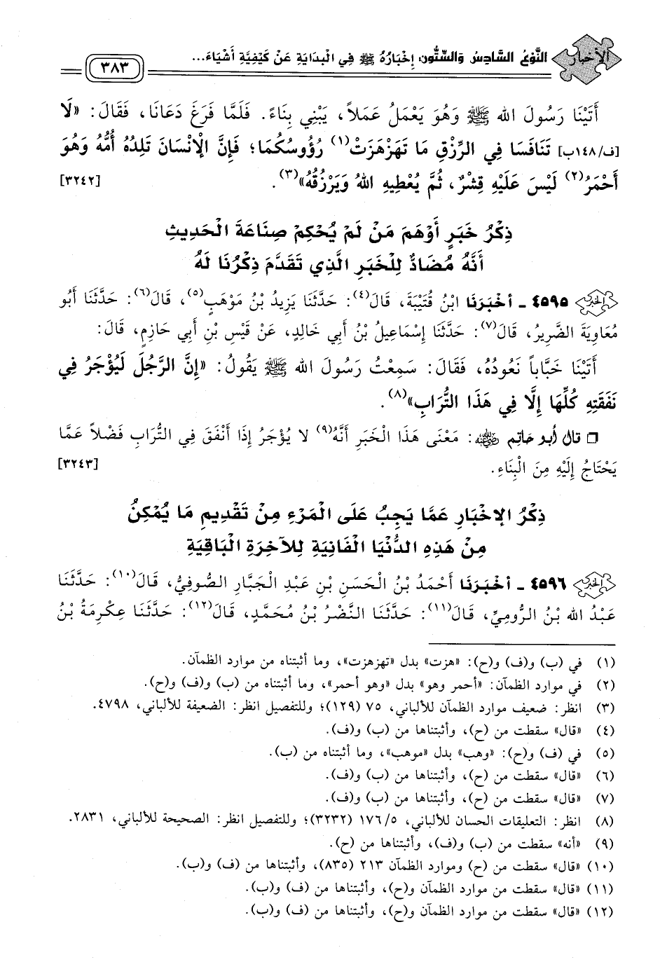 قَالَ أَبُو حَاتِمٍ رَضِيَ اللهُ عَنْهُ: مَعْنَى هَذَا الْخَبَرِ: أنه لَا يُؤْجَرُ إِذَا أَنْفَقَ فِي التُّرَابِ فَضْلاً عَمَّا يَحْتَاجُ إِلَيْهِ مِنَ الْبِنَاءِ. [٣٢٤٣]