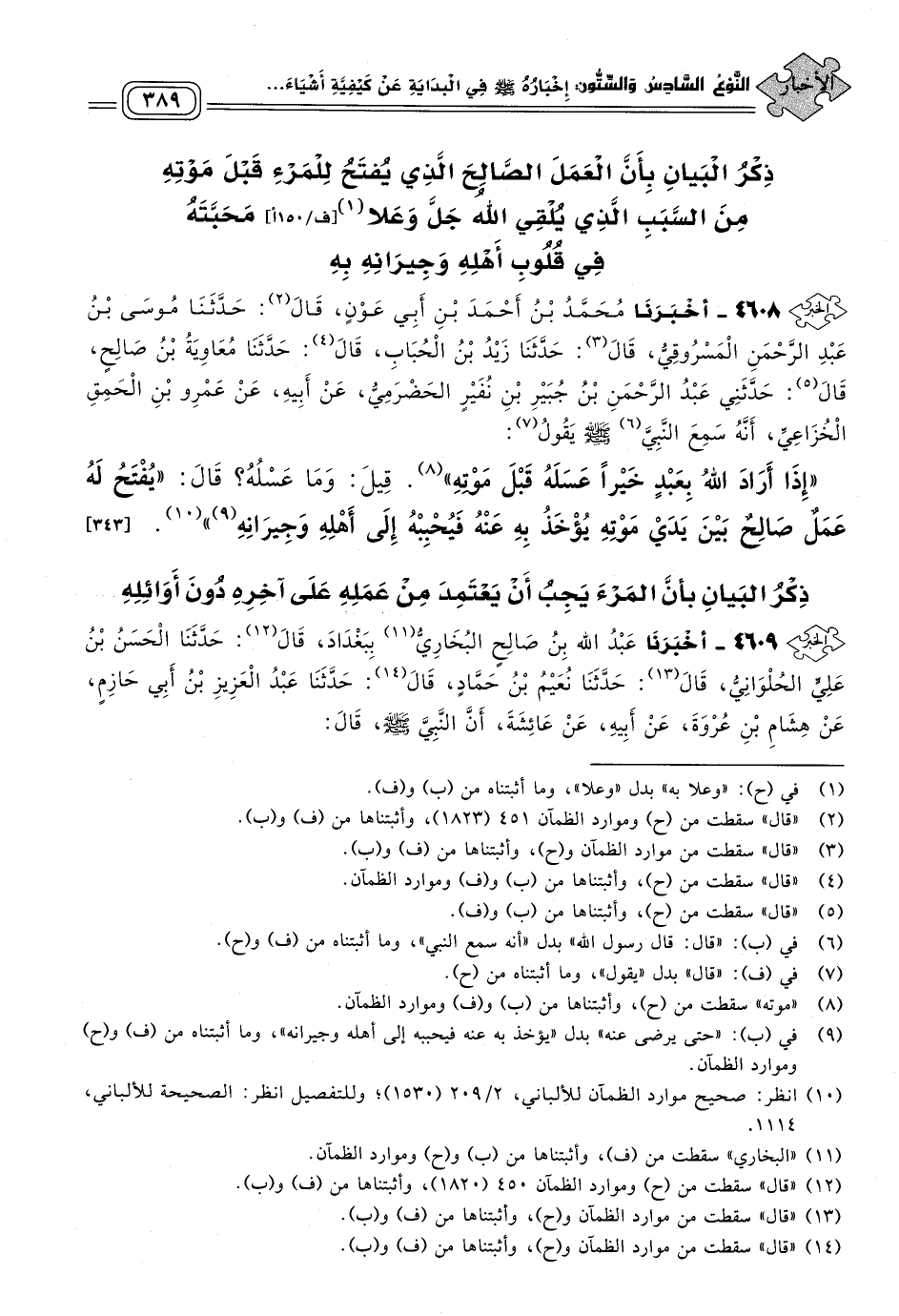 ٤٦٠٩ - أَخبَرنا عَبْدُ اللهِ بْنُ صَالِحٍ الْبُخَارِيُّ بِبَغْدَادَ، قَالَ: حَدثنا الْحَسَنُ بْنُ عَلِيٍّ الْحُلْوَانِيُّ، قَالَ: حَدثنا نُعَيْمُ بْنُ حَمَّادٍ، قَالَ: حَدثنا عَبْدُ الْعَزِيزِ بْنُ أَبِي حَازِمٍ، عَنْ هِشَامِ بْنِ عُرْوَةَ، عَنْ أَبِيهِ، عَنْ عَائِشَةَ؛ أَنَّ النَّبِيَّ صَلى الله عَلَيه وسَلم قَالَ: "إِنَّمَا الأَعْمَالُ بِالْخَوَاتِيمِ". [٣٤٠]