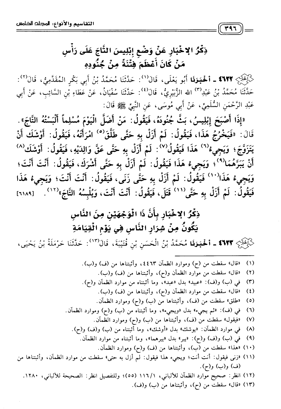 ٤٦٢٢ - أَخبَرنا أَبُو يَعْلَى، قَالَ: حَدثنا مُحَمَّدُ بْنُ أَبِي بَكْرٍ الْمُقَدَّمِيُّ، قَالَ: حَدثنا مُحَمَّدُ بْنُ عَبْدِ اللهِ الزُّبَيْرِيُّ، قَالَ: حَدثنا سُفْيَانُ، عَنْ عَطَاءِ بْنِ السَّائِبِ، عَنْ أَبِي عَبْدِ الرَّحْمَنِ السُّلَمِيِّ، عَنْ أَبِي مُوسَى، عَنِ النَّبِيِّ صَلى الله عَلَيه وسَلم قَالَ: "إِذَا أَصْبَحَ إِبْلِيسُ بَثَّ جُنُودَهُ، فَيَقُولُ: مَنْ أَضَلَّ الْيَوْمَ مُسْلِمًا أَلْبَسْتُهُ التَّاجَ"، قَالَ: "فَيَخْرُجُ هَذَا، فَيَقُولُ: لَمْ أَزَلْ بِهِ حَتَّى طَلَّقَ امْرَأَتَهُ، فَيَقُولُ: أَوْشَكَ أَنْ يَتَزَوَّجَ، وَيَجِيءُ هَذَا فَيَقُولُ: لَمْ أَزَلْ بِهِ حَتَّى عَقَّ وَالِدَيْهِ، فَيَقُولُ: أَوْشَكَ أَنْ يَبَرَّهُمَا، وَيَجِيءُ هَذَا فَيَقُولُ: لَمْ أَزَلْ بِهِ حَتَّى أَشْرَكَ، فَيَقُولُ: أَنْتَ أَنْتَ، وَيَجِيءُ هذا فَيَقُولُ: لَمْ أَزَلْ بِهِ حَتَّى زَنَى، فَيَقُولُ: أَنْتَ أَنْتَ، وَيَجِيءُ هَذَا فَيَقُولُ: لَمْ أَزَلْ بِهِ حَتَّى قَتَلَ، فَيَقُولُ: أَنْتَ أَنْتَ، وَيُلْبِسُهُ التَّاجَ". [٦١٨٩]