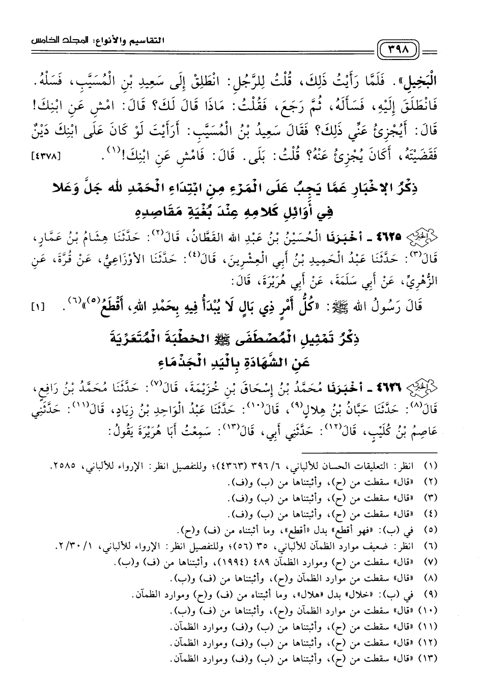 ٤٦٢٥ - أَخبَرنا الْحُسَيْنُ بْنُ عَبْدِ اللهِ الْقَطَّانُ، قَالَ: حَدثنا هِشَامُ بْنُ عَمَّارٍ، قَالَ: حَدثنا عَبْدُ الْحَمِيدِ بْنُ أَبِي الْعِشْرِينَ، قَالَ: حَدثنا الأَوْزَاعِيُّ، عَنْ قُرَّةَ، عَنِ الزُّهْرِيِّ، عَنْ أَبِي سَلَمَةَ، عَنْ أَبِي هُرَيْرَةَ، قَالَ: قَالَ رَسُولُ اللهِ صَلى الله عَلَيه وسَلم: "كُلُّ أَمْرٍ ذِي بَالٍ لَا يُبْدَأُ فِيهِ بِحَمْدِ اللهِ، أَقْطَعُ". [١]