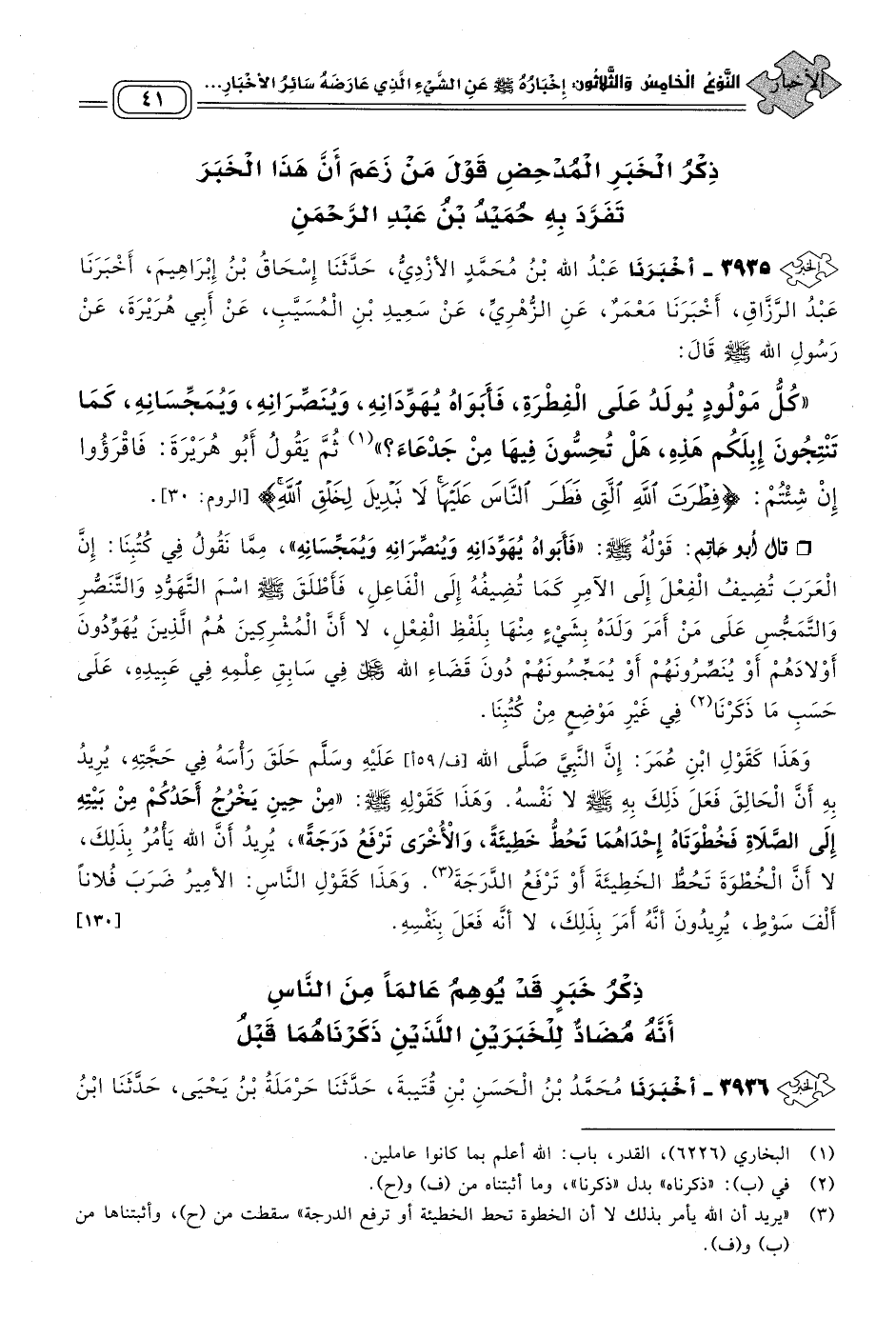 ٣٩٣٥ - أَخبَرنا عَبْدُ اللهِ بْنُ مُحَمَّدٍ الأَزْدِيُّ، حَدثنا إِسْحَاقُ بْنُ إِبْرَاهِيمَ، أَخبَرنا عَبْدُ الرَّزَّاقِ، أَخبَرنا مَعْمَرٌ، عَنِ الزُّهْرِيِّ، عَنْ سَعِيدِ بْنِ الْمُسَيَّبِ، عَنْ أَبِي هُرَيْرَةَ، عَنْ رَسُولِ اللهِ صَلى الله عَلَيه وسَلم قَالَ: "كُلُّ مَوْلُودٍ يُولَدُ عَلَى الْفِطْرَةِ، فَأَبَوَاهُ يُهَوِّدَانِهِ وَيُنَصِّرَانِهِ وَيُمَجِّسَانِهِ، كَمَا تَنْتِجُونَ إِبِلَكُمْ هَذِهِ، هَلْ تُحِسُّونَ فِيهَا مِنْ جَدْعَاءَ؟ " ثُمَّ يَقُولُ أَبُو هُرَيْرَةَ: فَاقْرَؤُوا إِنْ شِئْتُمْ: {فِطْرَتَ اللهِ الَّتِي فَطَرَ النَّاسَ عَلَيْهَا لَا تَبْدِيلَ لِخَلْقِ اللهِ} [الروم: ٣٠].