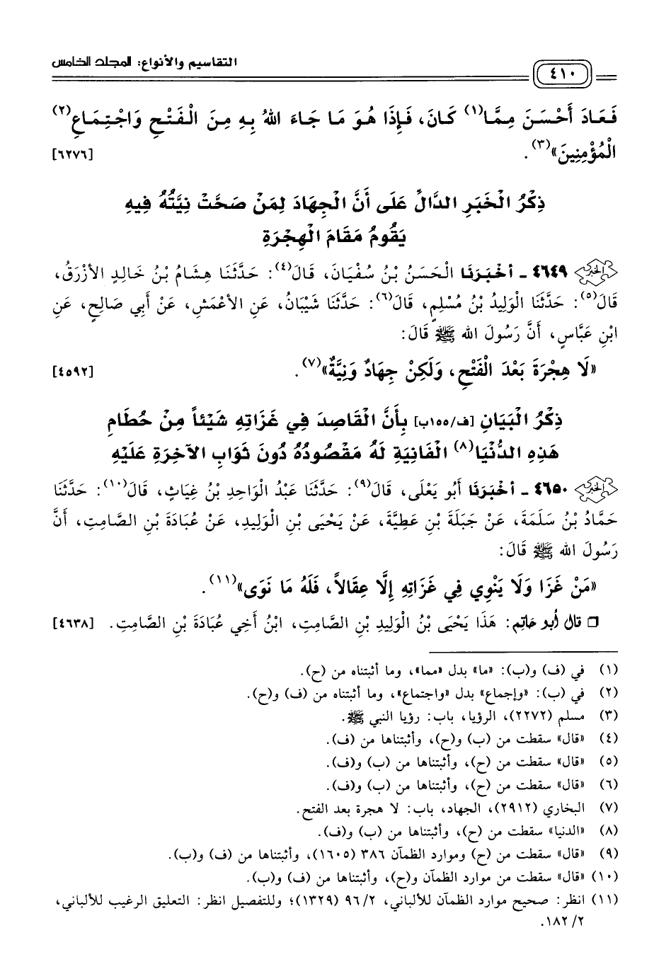 ٤٦٤٩ - أَخبَرنا الْحَسَنُ بْنُ سُفْيَانَ، قال: حَدثنا هِشَامُ بْنُ خَالِدٍ الأَزْرَقُ، قَالَ: حَدثنا الْوَلِيدُ بْنُ مُسْلِمٍ، قَالَ: حَدثنا شَيْبَانُ، عَنِ الأَعْمَشِ، عَنْ أَبِي صَالِحٍ، عَنِ ابْنِ عَبَّاسٍ، أَنَّ رَسُولَ اللهِ صَلى الله عَلَيه وسَلم قَالَ: "لَا هِجْرَةَ بَعْدَ الْفَتْحِ، وَلَكِنْ جِهَادٌ وَنِيَّةٌ". [٤٥٩٢]