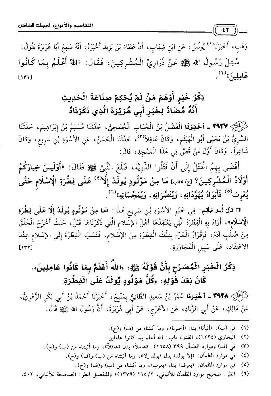 ٣٩٣٨ - أَخبَرنا عُمَرُ بْنُ سَعِيدٍ الطَّائِيُّ بِمَنْبِجَ، أَخبَرنا أَحْمَدُ بْنُ أَبِي بَكْرٍ الزُّهْرِيُّ، عَنْ مَالِكٍ، عَنْ أَبِي الزِّنَادِ، عَنِ الأَعْرَجِ، عَنْ أَبِي هُرَيْرَةَ، أَنَّ رَسُولَ اللهِ صَلى الله عَلَيه وسَلم قَالَ: "كُلُّ مَوْلُودٍ يُولَدُ عَلَى الْفِطْرَةِ، فَأَبَوَاهُ يُهَوِّدَانِهِ وَيُنَصِّرَانِهِ كَمَا تُنَاتَجُ الإِبِلُ مِنْ بَهِيمَةٍ جَمْعَاءَ هَلْ تُحِسُّ مِنْ جَدْعَاءَ؟ " قَالُوا: يَا رَسُولَ اللهِ، أَفَرَأَيْتَ مَنْ يَمُوتُ وَهُوَ صَغِيرٌ؟ قَالَ: "اللهُ أَعْلَمُ بِمَا كَانُوا عَامِلِينَ". [١٣٣]