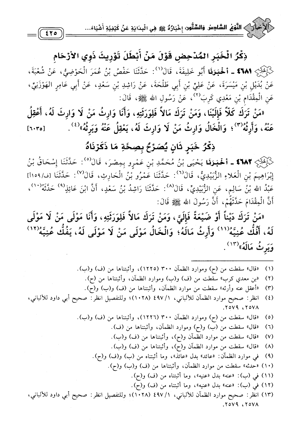 ٤٦٨١ - أَخبَرنا أَبُو خَلِيفَةَ، قَالَ: حَدثنا حَفْصُ بْنُ عُمَرَ الْحَوْضِيُّ، عَنْ شُعْبَةَ، عَنْ بُدَيْلِ بْنِ مَيْسَرَةَ، عَنْ عَلِيِّ بْنِ أَبِي طَلْحَةَ، عَنْ رَاشِدِ بْنِ سَعْدٍ، عَنْ أَبِي عَامِرٍ الْهَوْزَنِيِّ، عَنِ الْمِقْدَامِ بْنِ مَعْدِي كَرِبَ، عَنْ رَسُولِ اللهِ صَلى الله عَلَيه وسَلم قَالَ: "مَنْ تَرَكَ كَلاًّ فَإِلَيْنَا، وَمَنْ تَرَكَ مَالاً فَلِوَرَثَتِهِ، وَأَنَا وَارِثُ مَنْ لَا وَارِثَ لَهُ، أَعْقِلُ عَنْهُ، وَأَرِثُهُ، وَالْخَالُ وَارِثُ مَنْ لَا وَارِثَ لَهُ، يَعْقِلُ عَنْهُ وَيَرِثُهُ". [٦٠٣٥]