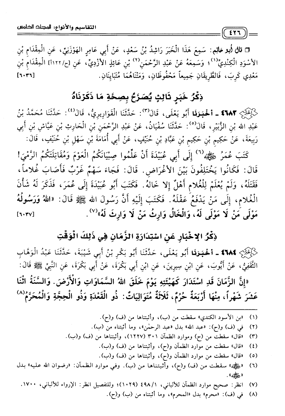 ٤٦٨٤ - أَخبَرنا أَبُو يَعْلَى، حَدثنا أَبُو بَكْرِ بْنُ أَبِي شَيْبَةَ، حَدثنا عَبْدُ الْوَهَّابِ الثَّقَفِيُّ، عَنْ أَيُّوبَ، عَنِ ابْنِ سِيرِينَ، عَنِ ابْنِ أَبِي بَكْرَةَ، عَنْ أَبِي بَكْرَةَ، عَنِ النَّبِيِّ صَلى الله عَلَيه وسَلم قَالَ: "إِنَّ الزَّمَانَ قَدِ اسْتَدَارَ كَهَيْئَتِهِ يَوْمَ خَلَقَ اللهُ السَّمَاوَاتِ وَالأَرْضَ، وَالسَّنَةُ اثْنَا عَشَرَ شَهْرًا، مِنْهَا أَرْبَعَةٌ حُرُمٌ، ثَلَاثَةٌ مُتَوَالِيَاتٌ: ذُو الْقَعْدَةِ، وَذُو الْحِجَّةِ، وَالْمُحَرَّمُ، وَرَجَبُ مُضَرَ الَّذِي بَيْنَ جُمَادَى وَشَعْبَانَ"، ثُمَّ قَالَ: "أَيُّ شَهْرٍ هَذَا؟ " قُلْنَا: اللهُ وَرَسُولُهُ أَعْلَمُ، قَالَ: فَسَكَتَ حَتَّى ظَنَنَّا أَنَّهُ سَيُسَمِّيهِ بِغَيْرِ اسْمِهِ، قَالَ: "أَلَيْسَ ذو الْحِجَّةِ؟ " قُلْنَا: بَلَى، قَالَ: "فَأَيُّ بَلَدٍ هَذَا؟ " قُلْنَا: اللهُ وَرَسُولُهُ أَعْلَمُ، قَالَ: فَسَكَتَ حَتَّى ظَنَنَّا أَنَّهُ سَيُسَمِّيهِ بِغَيْرِ اسْمِهِ، قَالَ: "أَلَيْسَ الْبَلَدَ الْحَرَامَ؟ " قُلْنَا: بَلَى، قَالَ: "فَأَيُّ يَوْمٍ هَذَا؟ " قُلْنَا: اللهُ وَرَسُولُهُ أَعْلَمُ، قَالَ: فَسَكَتَ حَتَّى ظَنَنَّا أَنَّهُ سَيُسَمِّيهِ بِغَيْرِ اسْمِهِ، قَالَ: "أَلَيْسَ يَوْمَ النَّحْرِ؟ " قُلْنَا: بَلَى، قَالَ: "فَإِنَّ دِمَاءَكُمْ وَأَمْوَالَكُمْ"، قَالَ مُحَمَّدٌ: وَأَحْسِبُهُ قَالَ: "وَأَعْرَاضَكُمْ حَرَامٌ عَلَيْكُمْ كَحُرْمَةِ يَوْمِكُمْ هَذَا، فِي شَهْرِكُمْ هَذَا، فِي بَلَدِكُمْ هَذَا، وَسَتَلْقَوْنَ رَبَّكُمْ فَيَسْأَلُكُمْ عَنْ أَعْمَالِكُمْ، فَلَا تَرْجِعُوا بَعْدِي ضُلَاّلاً يَضْرِبُ بَعْضُكُمْ رِقَابَ بَعْضٍ، أَلَا لِيُبَلِّغِ الشَّاهِدُ الْغَائِبَ، فَلَعَلَّ بَعْضَ مَنْ يَبْلُغُهُ يَكُونُ أَوْعَى لَهُ مِنْ بَعْضِ مَنْ سَمِعَهُ، أَلَا هَلْ بَلَّغْتُ؟ ". [٥٩٧٥]