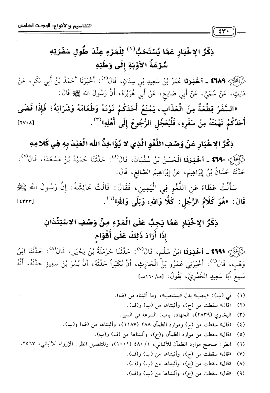 ٤٦٨٩ - أَخبَرنا عُمَرُ بْنُ سَعِيدِ بْنِ سِنَانٍ، قَالَ: أَخبَرنا أَحْمَدُ بْنُ أَبِي بَكْرٍ، عَنْ مَالِكٍ، عَنْ سُمَيٍّ، عَنْ أَبِي صَالِحٍ، عَنْ أَبِي هُرَيْرَةَ، أَنَّ رَسُولَ اللهِ صَلى الله عَلَيه وسَلم قَالَ: "السَّفَرُ قِطْعَةٌ مِنَ الْعَذَابِ، يَمْنَعُ أَحَدَكُمْ نَوْمَهُ وَطَعَامَهُ وَشَرَابَهُ، فَإِذَا قَضَى أَحَدُكُمْ نَهْمَتَهُ مِنْ سَفَرِهِ، فَلْيُعَجِّلِ الرُّجُوعَ إِلَى أَهْلِهِ". [٢٧٠٨]