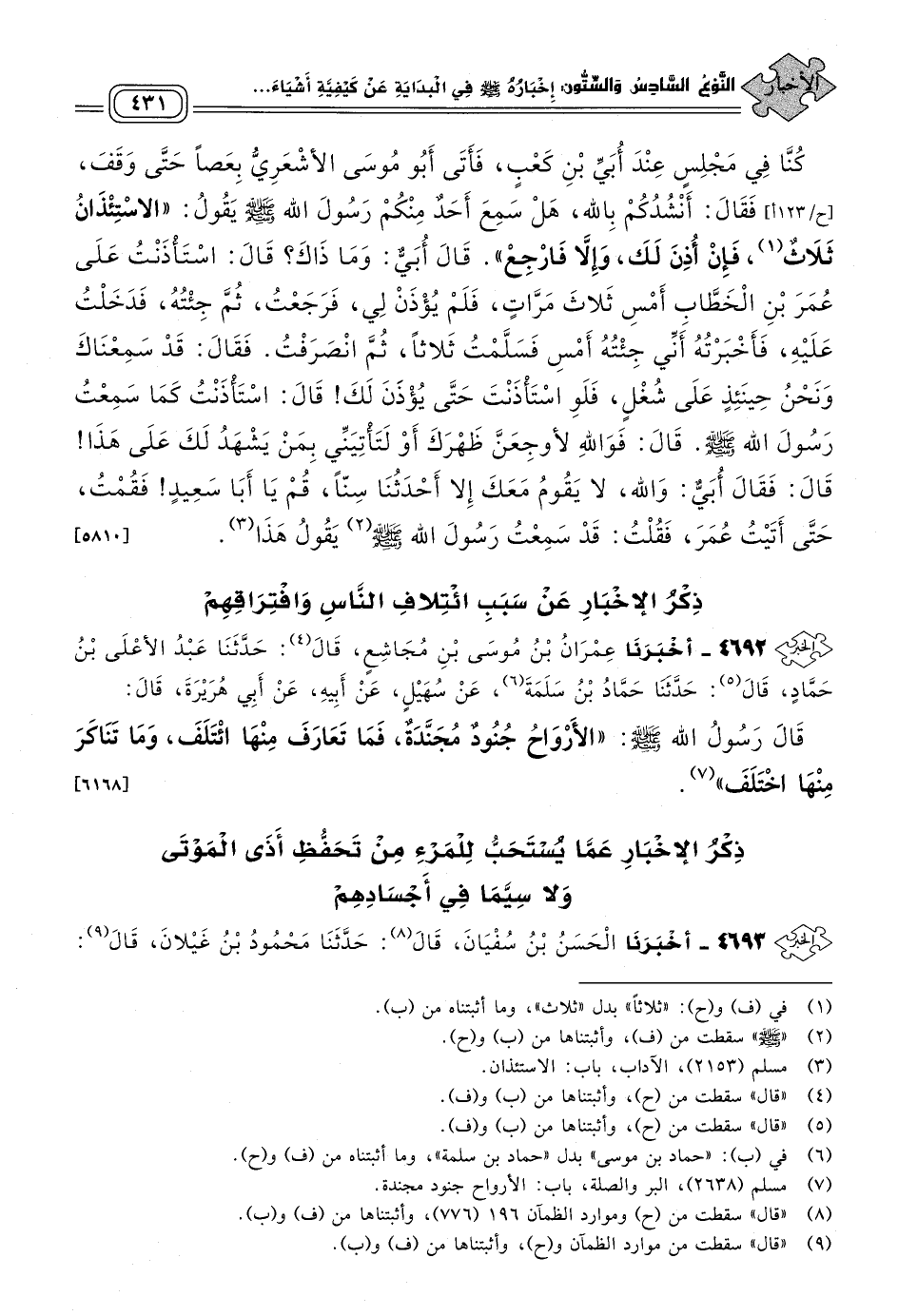 ٤٦٩٢ - أَخبَرنا عِمْرَانُ بْنُ مُوسَى بْنِ مُجَاشِعٍ، قَالَ: حَدثنا عَبْدُ الأَعْلَى بْنُ حَمَّادٍ، قَالَ: حَدثنا حَمَّادُ بْنُ سَلَمَةَ، عَنْ سُهَيْلٍ، عَنْ أَبِيهِ، عَنْ أَبِي هُرَيْرَةَ، قَالَ: قَالَ رَسُولُ اللهِ صَلى الله عَلَيه وسَلم: "الأَرْوَاحُ جُنُودٌ مُجَنَّدَةٌ، فَمَا تَعَارَفَ مِنْهَا ائْتَلَفَ، وَمَا تَنَاكَرَ مِنْهَا اخْتَلَفَ". [٦١٦٨]