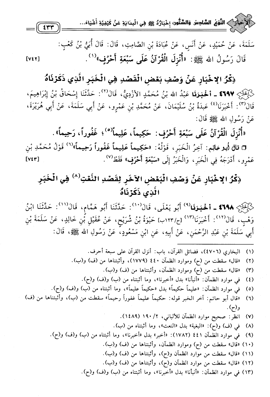 قَالَ أَبُو حَاتِمٍ: آخر الخبر، قوله: "حَكِيمًا عَلِيمًا غَفُورًا رَحِيمًا" قَوْلُ مُحَمَّدِ بْنِ عَمْرٍو، أَدْرَجَهُ فِي الْخَبَرِ، وَالْخَبَرُ إِلَى "سَبْعَةِ أَحْرُفٍ" فَقَطْ. [٧٤٣]