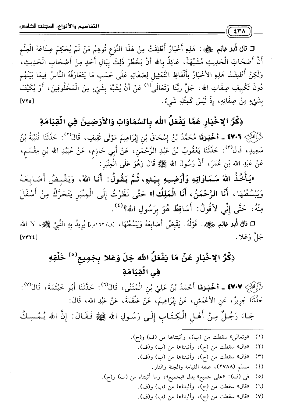 قَالَ أَبُو حَاتِمٍ رَضِيَ اللهُ عَنْهُ: قَوْلُهُ: يَقْبِضُ أَصَابِعَهُ وَيَبْسُطُهَا، يُرِيدُ بِهِ النَّبِيَّ صَلى الله عَلَيه وسَلم لَا اللهَ جَلَّ وَعَلَا. [٧٣٢٤]