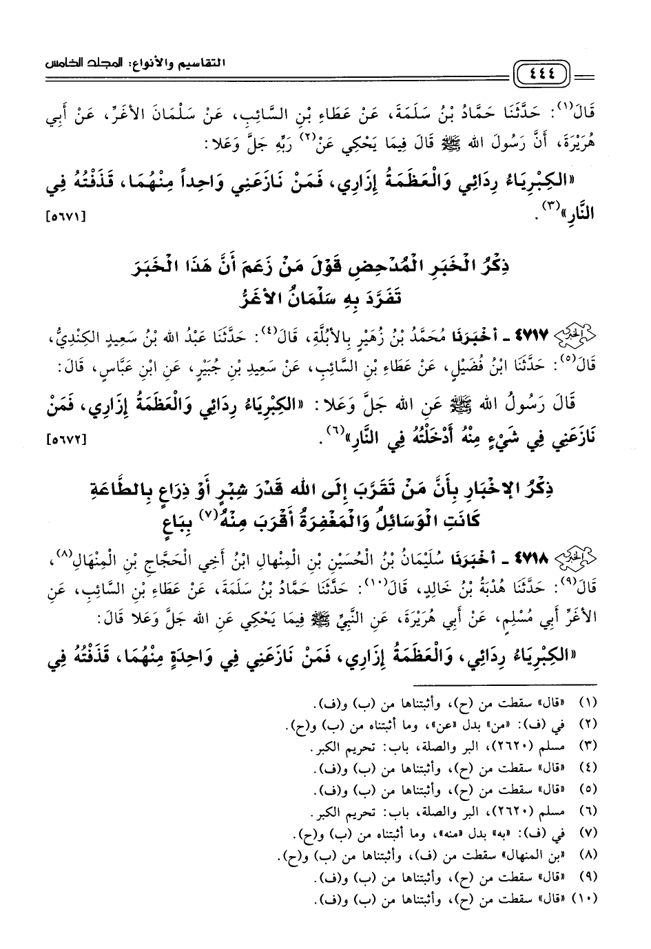 ٤٧١٨ - أَخبَرنا سُلَيْمَانُ بْنُ الْحُسَيْنِ بْنِ الْمِنْهَالِ ابْنُ أَخِي الْحَجَّاجِ بْنِ الْمِنْهَالِ، قَالَ: حَدثنا هُدْبَةُ بْنُ خَالِدٍ، قَالَ: حَدثنا حَمَّادُ بْنُ سَلَمَةَ، عَنْ عَطَاءِ بْنِ السَّائِبِ، عَنِ الأَغَرِّ أَبِي مُسْلِمٍ، عَنْ أَبِي هُرَيْرَةَ، عَنِ النَّبِيِّ صَلى الله عَلَيه وسَلم فِيمَا يَحْكِي عَنِ اللهِ جَلَّ وَعَلَا، قَالَ: "الْكِبْرِيَاءُ رِدَائِي، وَالْعَظَمَةُ إِزَارِي، فَمَنْ نَازَعَنِي فِي وَاحِدَةٍ مِنْهُمَا، قَذَفْتُهُ فِي النَّارِ، وَمَنِ اقْتَرَبَ إِلَيَّ شِبْرًا، اقْتَرَبْتُ مِنْهُ ذِرَاعًا، وَمَنِ اقْتَرَبَ مِنِّي ذِرَاعًا، اقْتَرَبْتُ مِنْهُ بَاعًا، وَمَنْ جَاءَنِي يَمْشِي، جِئْتُهُ أُهَرْوِلُ، وَمَنْ جَاءَنِي يُهَرْوِلُ، جِئْتُهُ أَسْعَى، وَمَنْ ذَكَرَنِي فِي نَفْسِهِ، ذَكَرْتُهُ فِي نَفْسِي، وَمَنْ ذَكَرَنِي فِي مَلأٍ، ذَكَرْتُهُ فِي مَلأٍ أَكْثَرَ مِنْهُمْ وَأَطْيَبَ". [٣٢٨]