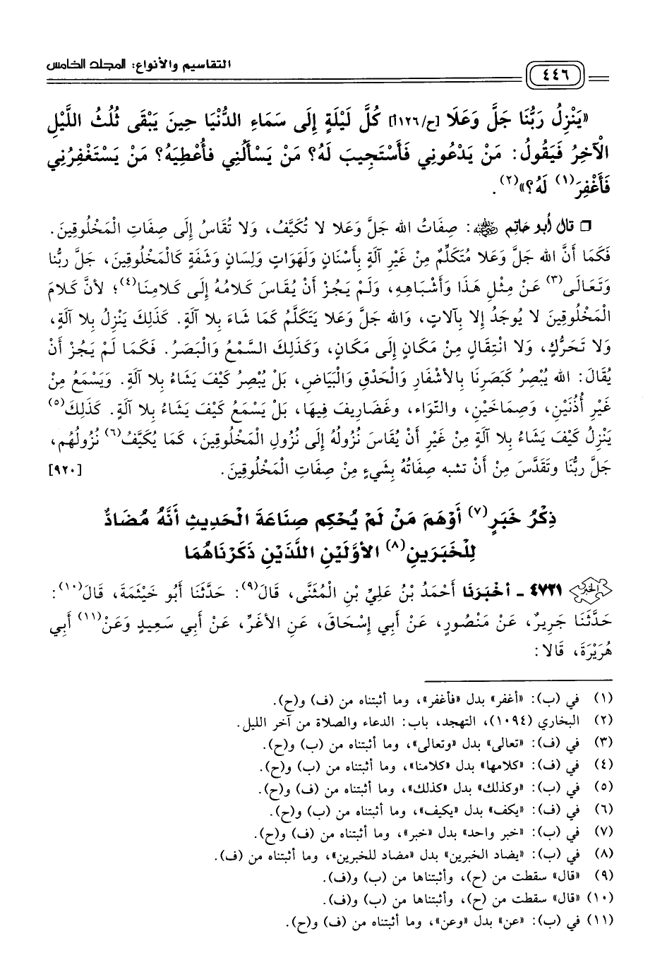 قَالَ أَبُو حَاتِمٍ رَضِيَ اللهُ عَنْهُ: صِفَاتُ اللهِ جَلَّ وَعَلَا لَا تُكَيَّفُ، وَلَا تُقَاسُ إِلَى صِفَاتِ الْمَخْلُوقِينَ، فَكَمَا أَنَّ اللهَ جَلَّ وَعَلَا مُتَكَلِّمٌ مِنْ غَيْرِ آلَةٍ بَأَسْنَانٍ وَلَهَوَاتٍ وَلِسَانٍ وَشَفَةٍ كَالْمَخْلُوقِينَ، جَلَّ رَبُّنَا وَتَعَالَى عَنْ مِثْلِ هَذَا وَأَشْبَاهِهِ، وَلَمْ يَجُزْ أَنْ يُقَاسَ كَلَامُهُ إِلَى كَلَامِنَا، لأَنَّ كَلَامَ الْمَخْلُوقِينَ لَا يُوجَدُ إِلَاّ بِآلَاتٍ، وَاللهُ جَلَّ وَعَلَا يَتَكَلَّمُ كَمَا شَاءَ بِلَا آلَةٍ، كَذَلِكَ يَنْزِلُ بِلَا آلَةٍ، وَلَا تَحَرُّكٍ، وَلَا انْتِقَالٍ مِنْ مَكَانٍ إِلَى مَكَانٍ، وَكَذَلِكَ السَّمْعُ وَالْبَصَرُ، فَكَمَا لَمْ يَجُزْ أَنْ يُقَالَ: اللهُ يُبْصِرُ كَبَصَرِنَا بِالأَشْفَارِ وَالْحَدَقِ وَالْبَيَاضِ، بَلْ يُبْصِرُ كَيْفَ يَشَاءُ بِلَا آلَةٍ، وَيَسْمَعُ مِنْ غَيْرِ أُذُنَيْنِ، وَصِمَاخَيْنِ، وَالْتِوَاءٍ، وَغَضَارِيفَ فِيهَا، بَلْ يَسْمَعُ كَيْفَ يَشَاءُ بِلَا آلَةٍ، كَذَلِكَ يَنْزِلُ كَيْفَ يَشَاءُ بِلَا آلَةٍ مِنْ غَيْرِ أَنْ يُقَاسَ نُزُولُهُ إِلَى نُزُولِ الْمَخْلُوقِينَ، كَمَا يُكَيَّفُ نُزُولُهُمْ، جَلَّ رَبُّنَا وَتَقَدَّسَ مِنْ أَنْ تُشَبَّهَ صِفَاتُهُ بِشَيْءٍ مِنْ صِفَاتِ الْمَخْلُوقِينَ. [٩٢٠]