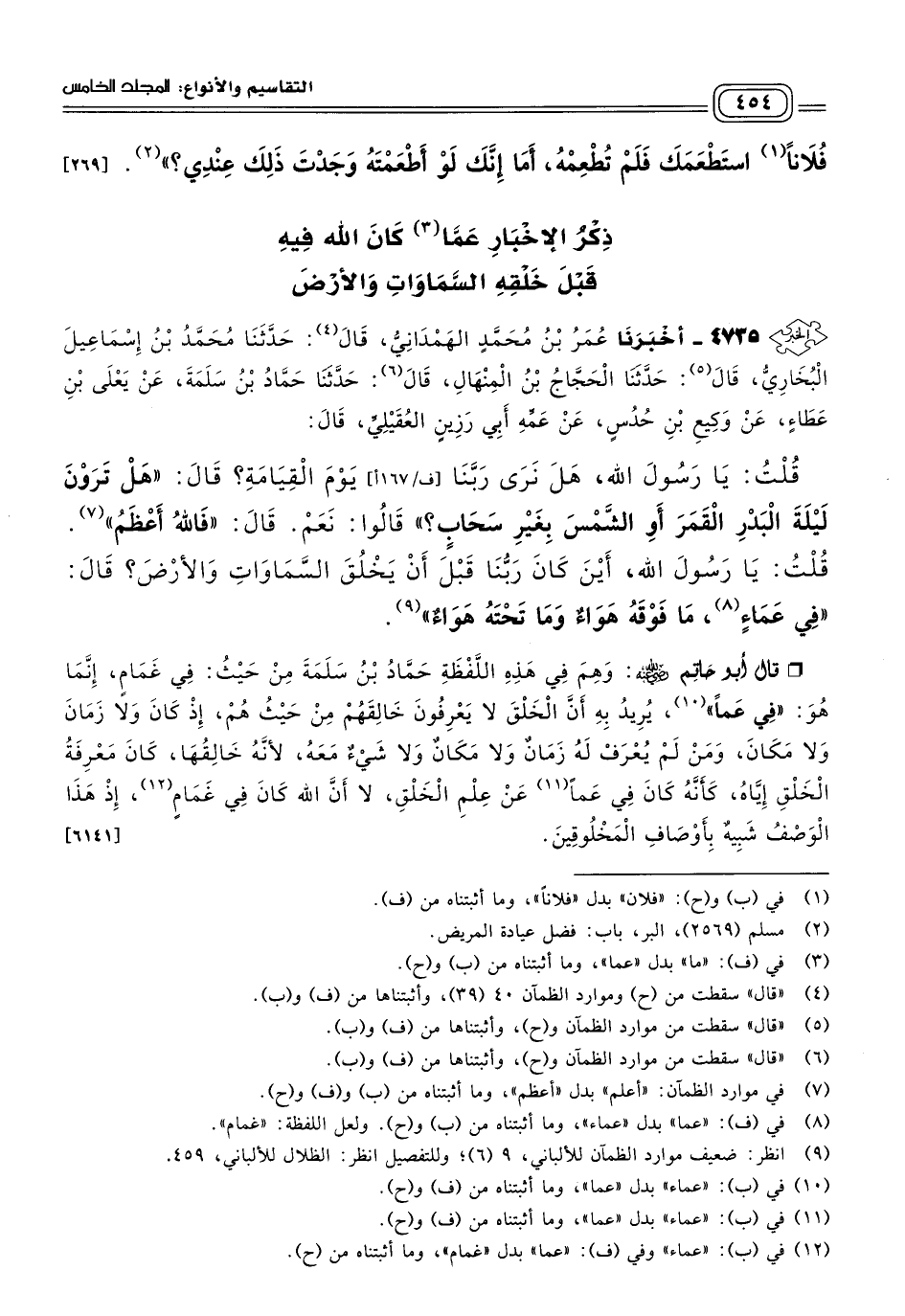 قَالَ أَبُو حَاتِمٍ رَضِيَ اللهُ عَنْهُ: وَهِمَ فِي هَذِهِ اللَّفْظَةِ حَمَّادُ بْنُ سَلَمَةَ مِنْ حَيْثُ: فِي غَمَامٍ، إِنَّمَا هُوَ: "فِي عَماً"، يُرِيدُ بِهِ أَنَّ الْخَلْقَ لَا يَعْرِفُونَ خَالِقَهُمْ مِنْ حَيْثُ هُمْ، إِذْ كَانَ وَلَا زَمَانَ وَلَا مَكَانَ، وَمَنْ لَمْ يُعْرَفْ لَهُ زَمَانٌ وَلَا مَكَانٌ وَلَا شَيْءٌ مَعَهُ، لأَنَّهُ خَالِقُهَا، كَانَ مَعْرِفَةُ الْخَلْقِ إِيَّاهُ، كَأَنَّهُ كَانَ فِي عَماً عَنْ عِلْمِ الْخَلْقِ، لَا أَنَّ اللهَ كَانَ فِي غَمَامٍ، إِذْ هَذَا الْوَصْفُ شَبِيهٌ بِأَوْصَافِ الْمَخْلُوقِينَ. [٦١٤١]