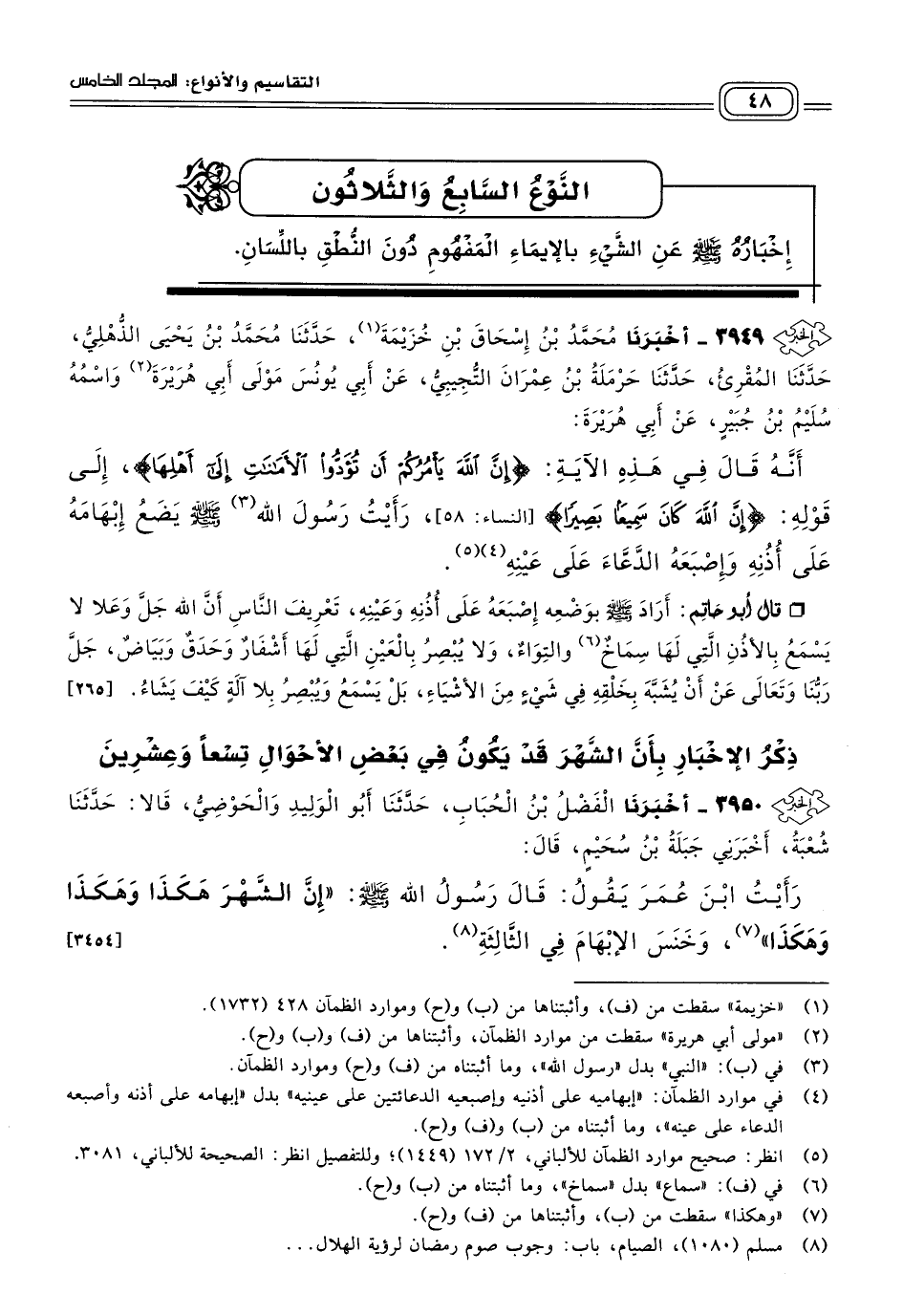 ٣٩٤٩ - أَخبَرنا مُحَمَّدُ بْنُ إِسْحَاقَ بْنِ خُزَيْمَةَ، حَدثنا مُحَمَّدُ بْنُ يَحْيَى الذُّهْلِيُّ، حَدثنا الْمُقْرِئُ، حَدثنا حَرْمَلَةُ بْنُ عِمْرَانَ التُّجِيبِيُّ، عَنْ أَبِي يُونُسَ مَوْلَى أَبِي هُرَيْرَةَ وَاسْمُهُ سُلَيْمُ بْنُ جُبَيْرٍ، عَنْ أَبِي هُرَيْرَةَ، أَنَّهُ قَالَ فِي هَذِهِ الآيَةِ: {إِنَّ اللهَ يَأْمُرُكُمْ أَنْ تُؤَدُّوا الأَمَانَاتِ إِلَى أَهْلِهَا} إِلَى قَوْلِهِ: {إِنَّ اللهَ كَانَ سَمِيعًا بَصِيرًا} [النساء: ٥٨]، رَأَيْتُ رسول الله صَلى الله عَلَيه وسَلم يَضَعُ إِبْهَامَهُ عَلَى أُذُنِهِ، وَإِصْبَعَهُ الدَّعَّاءَ عَلَى عَيْنِهِ.