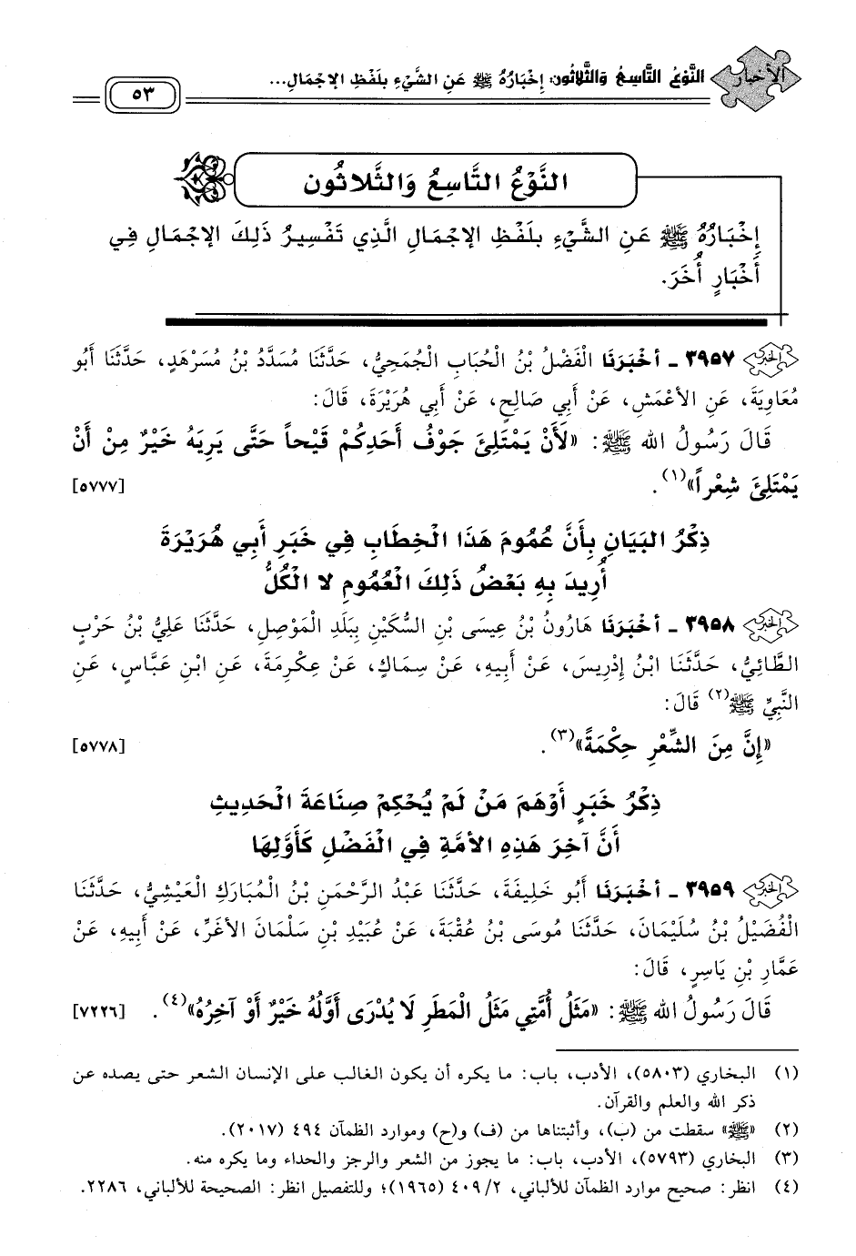 ٣٩٥٧ - أَخبَرنا الْفَضْلُ بْنُ الْحُبَابِ الْجُمَحِيُّ، حَدثنا مُسَدَّدُ بْنُ مُسَرْهَدٍ، حَدثنا أَبُو مُعَاوِيَةَ، عَنِ الأَعْمَشِ، عَنْ أَبِي صَالِحٍ، عَنْ أَبِي هُرَيْرَةَ، قَالَ: قَالَ رَسُولُ اللهِ صَلى الله عَلَيه وسَلم: "لأَنْ يَمْتَلِئَ جَوْفُ أَحَدِكُمْ قَيْحًا حَتَّى يَرِيَهُ خَيْرٌ مِنْ أَنْ يَمْتَلِئَ شِعْرًا". [٥٧٧٧]