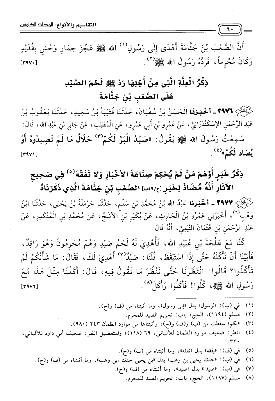 ٣٩٧٧ - أَخبَرنا عَبْدُ اللهِ بْنُ مُحَمَّدِ بْنِ سَلْمٍ، حَدثنا حَرْمَلَةُ بْنُ يَحْيَى، حَدثنا ابْنُ وَهْبٍ، أَخْبَرَنِي عَمْرُو بْنُ الْحَارِثِ، عَنْ بُكَيْرِ بْنِ الأَشَجِ، عَنْ مُحَمَّدِ بْنِ الْمُنْكَدِرِ، عَنْ عَبْدِ الرَّحْمَنِ بْنِ عُثْمَانَ التَّيْمِيِّ، أَنَّهُ قَالَ: كُنَّا مَعَ طَلْحَةَ بْنِ عُبَيْدِ اللهِ، فَأُهْدِيَ لَهُ لَحْمُ صَيْدٍ، وَهُمْ مُحْرِمُونَ، وَهُوَ رَاقِدٌ، فَأَبَيْنَا أَنْ نَأْكُلَهُ، حَتَّى إِذَا اسْتَيْقَظَ قُلْنَا: صَيْدٌ أُهْدِيَ لَكَ، فَقَالَ: مَا شَأْنُكُمْ لَمْ تَأْكُلُوا؟ قَالُوا: انْتَظَرْنَا حَتَّى نَنْظُرَ مَا تَقُولُ فِيهِ، قَالَ: أَكَلْنَا مِثْلَ هَذَا مَعَ رَسُولِ اللهِ صَلى الله عَلَيه وسَلم، كُلُوا، فَأَكَلُوا وَأَكَلَ. [٣٩٧٢]
