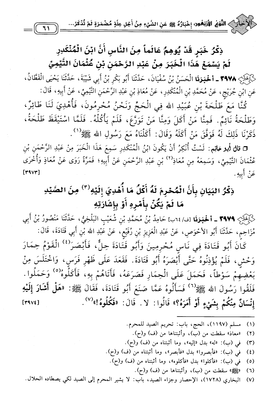 ٣٩٧٩ - أَخبَرنا حَامِدُ بْنُ مُحَمَّدِ بْنِ شُعَيْبٍ الْبَلْخِيُّ، حَدثنا مَنْصُورُ بْنُ أَبِي مُزَاحِمٍ، حَدثنا أَبُو الأَحْوَصِ، عَنْ عَبْدِ الْعَزِيزِ بْنِ رُفَيْعٍ، عَنْ عَبْدِ اللهِ بْنِ أَبِي قَتَادَةَ، قَالَ: كَانَ أَبُو قَتَادَةَ فِي نَاسٍ مُحْرِمِينَ وَأَبُو قَتَادَةَ حِلٌّ، فَأَبْصَرَ الْقَوْمُ حِمَارَ وَحْشٍ، فَلَمْ يُؤْذِنُوهُ حَتَّى أَبْصَرَهُ أَبُو قَتَادَةَ، فَقَعَدَ عَلَى ظَهْرِ فَرَسٍ، وَاخْتَلَسَ مِنْ بَعْضِهِمْ سَوْطًا، فَحَمَلَ عَلَى الْحِمَارِ فَصَرَعَهُ، فَأَتَاهُمْ بِهِ، فَأَكَلُوهُ وَحَمَلُوا، فَلَقُوا رَسُولَ اللهِ صَلى الله عَلَيه وسَلم، فَسَأَلُوهُ عَمَّا صَنَعَ أَبُو قَتَادَةَ، فَقَالَ صَلى الله عَلَيه وسَلم: "هَلْ أَشَارَ إِلَيْهِ إِنْسَانٌ مِنْكُمْ بِشَيْءٍ أَوْ أَمَرَهُ؟ " قَالُوا: لَا، قَالَ: "فَكُلُوهُ". [٣٩٧٤]