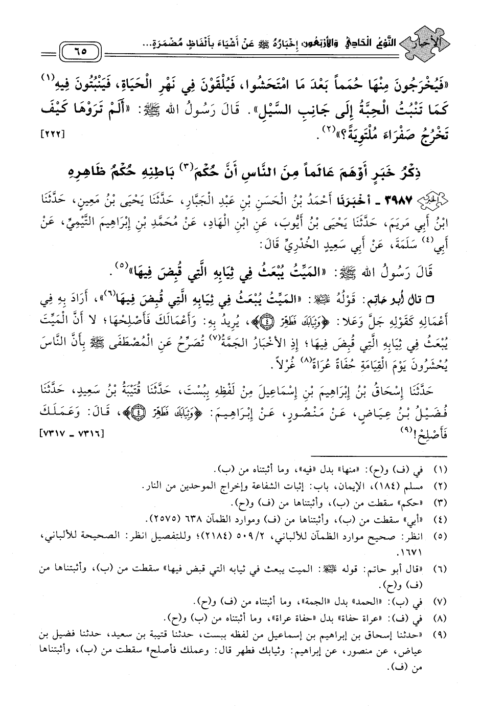 قَالَ أَبُو حَاتِمٍ: قَوْلُهُ عَلَيْهِ السَّلَامُ: "الْمَيِّتُ يُبْعَثُ فِي ثِيَابِهِ الَّتِي قُبِضَ فِيهَا"، أَرَادَ بِهِ فِي أَعْمَالِهِ كَقَوْلِهِ جَلَّ وَعَلَا: {وَثِيَابَكَ فَطَهِّرْ} يُرِيدُ بِهِ: وَأَعْمَالَكَ فَأَصْلِحْهَا لَا أَنَّ الْمَيِّتَ يُبْعَثُ فِي ثِيَابِهِ الَّتِي قُبِضَ فِيهَا، إِذِ الأَخْبَارُ الْجَمَّةُ تُصَرِّحُ عَنِ الْمُصْطَفَى صَلى الله عَلَيه وسَلم بِأَنَّ النَّاسَ يُحْشَرُونَ يَوْمَ الْقِيَامَةِ حُفَاةً عُرَاةً غُرْلاً.