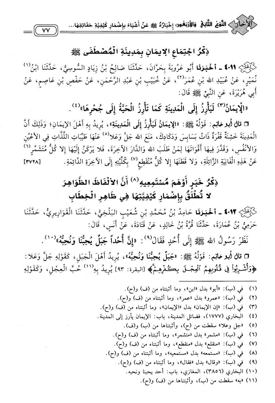 قَالَ أَبُو حَاتِمٍ: قَوْلُهُ صَلى الله عَلَيه وسَلم "جَبَلٌ يُحِبُّنَا وَنُحِبُّهُ"، يُرِيدُ أَهْلَ الْجَبَلِ، كَقَوْلِهِ جَلَّ وَعَلَا: {وَأُشْرِبُوا فِي قُلُوبِهِمُ الْعِجْلَ بِكُفْرِهِمْ} [البقرة: ٩٣] يُرِيدُ به حُبَّ الْعِجْلِ، وَكَقَوْلِهِ جَلَّ وَعَلَا: {وَاسْأَلِ الْقَرْيَةَ} [يوسف: ٨٢] يُرِيدُ بِهِ أَهْلَ الْقَرْيَةِ. وَالْقَصْدُ فِيهِ أَهْلُ الْمَدِينَةِ، فَأَطْلَقَ رَسُولُ اللهِ صَلى الله عَلَيه وسَلم خِطَابَ الْمَقْصُودِ بِهِ الْمَدِينَةَ عَلَى الْجَبَلِ الَّذِي هُوَ أُحُدٌ عَلَى سَبِيلِ الْمُقَارَبَةِ بَيْنَهُمَا وَالْمُجَاوَرَةِ. [٣٧٢٥]