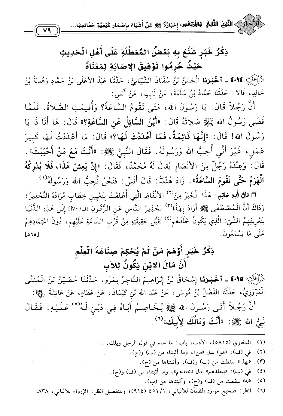 ٤٠١٤ - أَخبَرنا الْحَسَنُ بْنُ سُفْيَانَ الشَّيْبَانِيُّ، حَدثنا عَبْدُ الأَعْلَى بْنُ حَمَّادٍ، وَهُدْبَةُ بْنُ خَالِدٍ، قَالَا: حَدثنا حَمَّادُ بْنُ سَلَمَةَ، عَنْ ثَابِتٍ، عَنْ أَنَسٍ؛ أَنَّ رَجُلاً قَالَ: يَا رَسُولَ اللهِ، مَتَى تَقُومُ السَّاعَةُ؟ وَأُقِيمَتِ الصَّلَاةُ، فَلَمَّا قَضَى رَسُولُ اللهِ صَلى الله عَلَيه وسَلم صَلَاتَهُ، قَالَ: "أَيْنَ السَّائِلُ عَنِ السَّاعَةِ؟ " قَالَ: هَا أَنَا ذَا يَا رَسُولَ اللهِ، قَالَ: "إِنَّهَا قَائِمَةٌ فَمَا أَعْدَدْتَ لَهَا؟ " قَالَ: مَا أَعْدَدْتُ لَهَا كَبِيرَ عَمَلٍ غَيْرَ أَنِّي أُحِبُّ اللهَ وَرَسُولَهُ، فقَالَ النَّبِيُّ صَلى الله عَلَيه وسَلم: "أَنْتَ مَعَ مَنْ أَحْبَبْتَ"، قَالَ: وَعِنْدَهُ رَجُلٌ مِنَ الأَنْصَارِ يُقَالُ لَهُ مُحَمَّدٌ، فقَالَ: "إِنْ يَعِشْ هَذَا، فَلَا يُدْرِكُهُ الْهَرَمُ حَتَّى تَقُومَ السَّاعَةُ". زَادَ هُدْبَةُ: قَالَ أَنَسٌ: فَنَحْنُ نُحِبُّ اللهَ وَرَسُولَهُ.