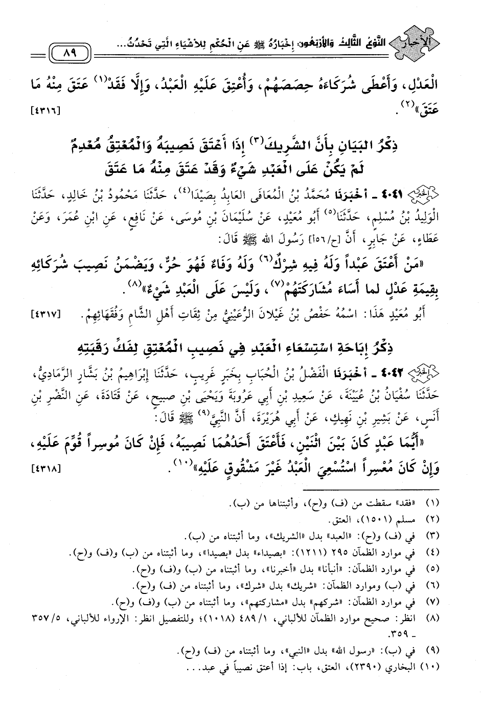 ٤٠٤٢ - أَخبَرنا الْفَضْلُ بْنُ الْحُبَابِ، بِخَبَرٍ غَرِيبٍ، حَدثنا إِبْرَاهِيمُ بْنُ بَشَّارٍ الرَّمَادِيُّ، حَدثنا سُفْيَانُ بْنُ عُيَيْنَةَ، عَنْ سَعِيدِ بْنِ أَبِي عَرُوبَةَ، وَيَحْيَى بْنِ صُبَيْحٍ، عَنْ قَتَادَةَ، عَنِ النَّضْرِ بْنِ أَنَسٍ، عَنْ بَشِيرِ بْنِ نَهِيكٍ، عَنْ أَبِي هُرَيْرَةَ، أَنَّ النبي صَلى الله عَلَيه وسَلم قَالَ: "أَيُّمَا عَبْدٍ كَانَ بَيْنَ اثْنَيْنِ فَأَعْتَقَ أَحَدُهُمَا نَصِيبَهُ، فَإِنْ كَانَ مُوسِرًا قُوِّمَ عَلَيْهِ، وَإِنْ كَانَ مُعْسِرًا اسْتُسْعِيَ الْعَبْدُ غَيْرَ مَشْقُوقٍ عَلَيْهِ". [٤٣١٨]