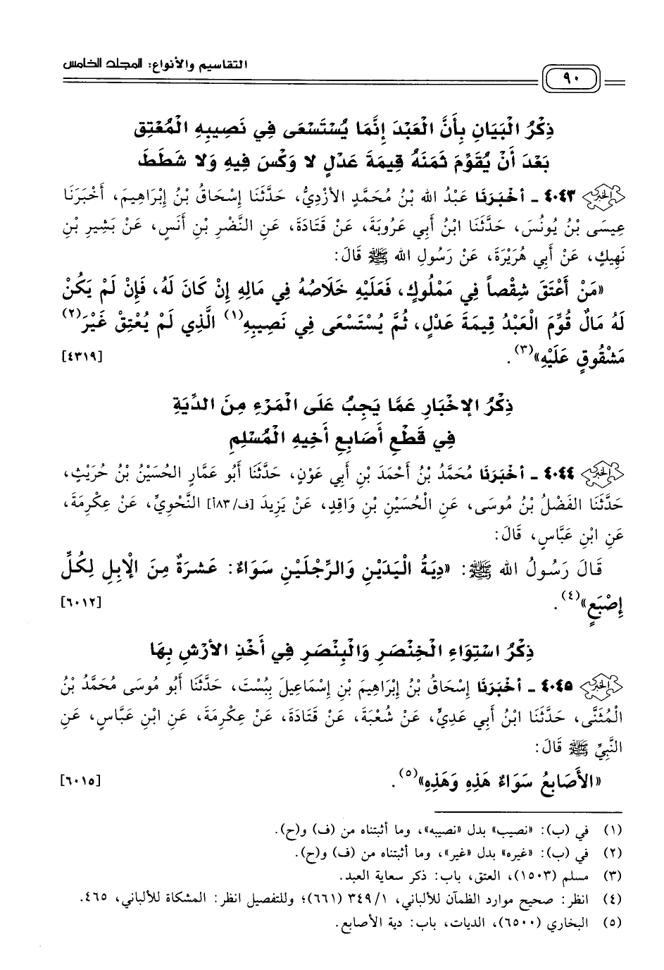 ٤٠٤٥ - أَخبَرنا إِسْحَاقُ بْنُ إِبْرَاهِيمَ بْنِ إِسْمَاعِيلَ، بِبُسْتَ، حَدثنا أَبُو مُوسَى مُحَمَّدُ بْنُ الْمُثَنَّى، حَدثنا ابْنُ أَبِي عَدِيٍّ، عَنْ شُعْبَةَ، عَنْ قَتَادَةَ، عَنْ عِكْرِمَةَ، عَنِ ابْنِ عَبَّاسٍ، عَنِ النَّبِيِّ صَلى الله عَلَيه وسَلم قَالَ: "الأَصَابِعُ سَوَاءٌ هَذِهِ وَهَذِهِ". [٦٠١٥]