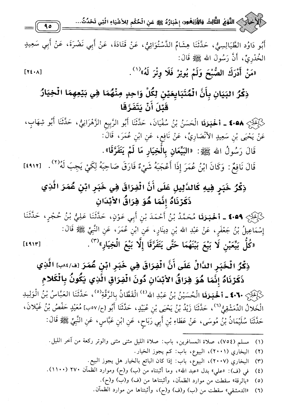 ٤٠٥٨ - أَخبَرنا الْحَسَنُ بْنُ سُفْيَانَ، حَدثنا أَبُو الرَّبِيعِ الزَّهْرَانِيُّ، حَدثنا أَبُو شِهَابٍ، عَنْ يَحْيَى بْنِ سَعِيدٍ الأَنْصَارِيِّ، عَنْ نَافِعٍ، عَنِ ابْنِ عُمَرَ، قَالَ: قَالَ رَسُولُ اللهِ صَلى الله عَلَيه وسَلم: "الْبَيِّعَانِ بِالْخِيَارِ مَا لَمْ يَتَفَرَّقَا".