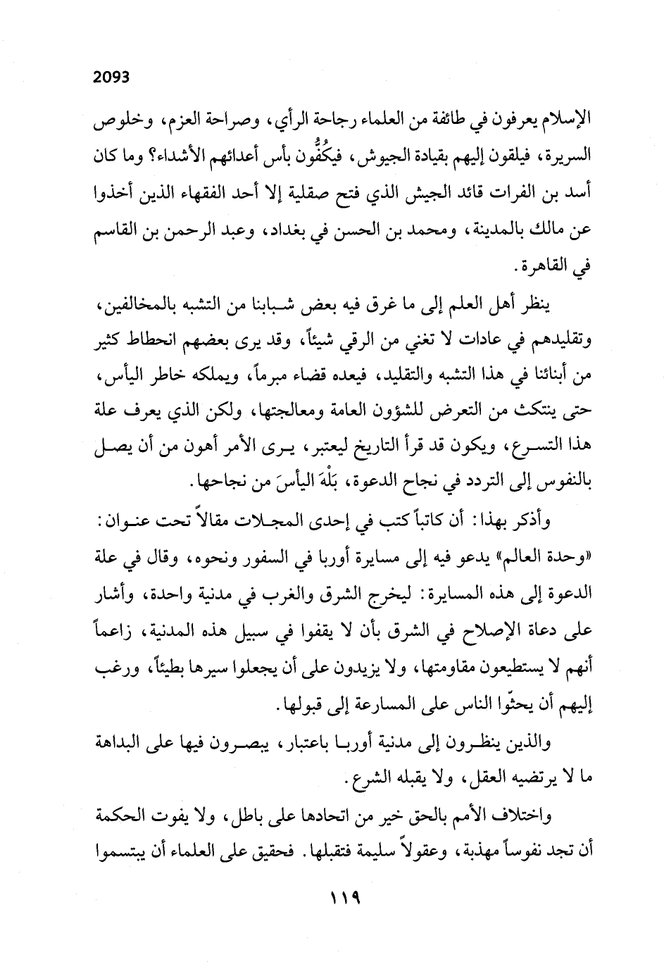وأذكر بهذا: أن كاتباً كتب في إحدى المجلات مقالاً تحت عنوان: "وحدة العالم" يدعو فيه إلى مسايرة أوربا في السفور ونحوه، وقال في علة الدعوة إلى هذه المسايرة: ليخرج الشرق والغرب في مدنية واحدة، وأشار على دعاة الإصلاح في الشرق بأن لا يقفوا في سبيل هذه المدنية، زاعماً أنهم لا يستطيعون مقاومتها، ولا يزيدون على أن يجعلوا سيرها بطيئاً، ورغب إليهم أن يحثّوا الناس على المسارعة إلى قبولها.