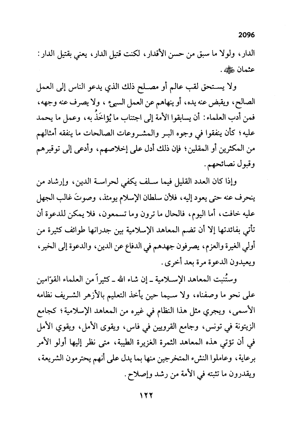 وستُنبت المعاهد الإسلامية - إن شاء الله - كثيراً من العلماء القوّامين على نحو ما وصفناه، ولا سيما حين يأخذ التعليم بالأزهر الشريف نظامه الأسمى، ويجري مثل هذا النظام في غيره من المعاهد الإسلامية؛ كجامع الزيتونة في تونس، وجامع القرويين في فاس، ويقوى الأمل، ويقوي الأمل في أن تؤتي هذه المعاهد الثمرة الغزيرة الطيبة، متى نظر إليها أولو الأمر برعاية، وعاملوا النشء المتخرجين منها بما يدل على أنهم يحترمون الشريعة، ويقدرون ما تثبته في الأمة من رشد وإصلاح.