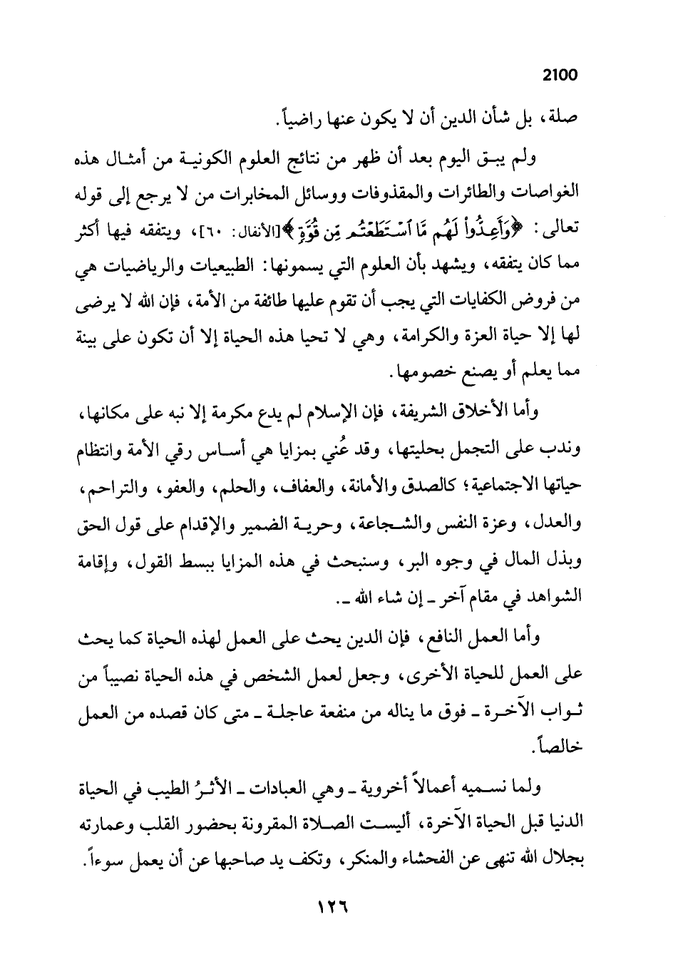 ولم يبق اليوم بعد أن ظهر من نتائج العلوم الكونية من أمثال هذه الغواصات والطائرات والمقذوفات ووسائل المخابرات من لا يرجع إلى قوله تعالى: {وَأَعِدُّوا لَهُمْ مَا اسْتَطَعْتُمْ مِنْ قُوَّةٍ} [الأنفال: 60]، ويتفقه فيها أكثر مما كان يتفقه، ويشهد بن العلوم التي يسمونها: الطبيعيات والرياضيات هي من فروض الكفايات التي يجب أن تقوم عليها طائفة من الأمة، فإن الله لا يرضى لها إلا حياة العزة والكرامة، وهي لا تحيا هذه الحياة إلا أن تكون على بينة مما يعلم أو يصنع خصومها.