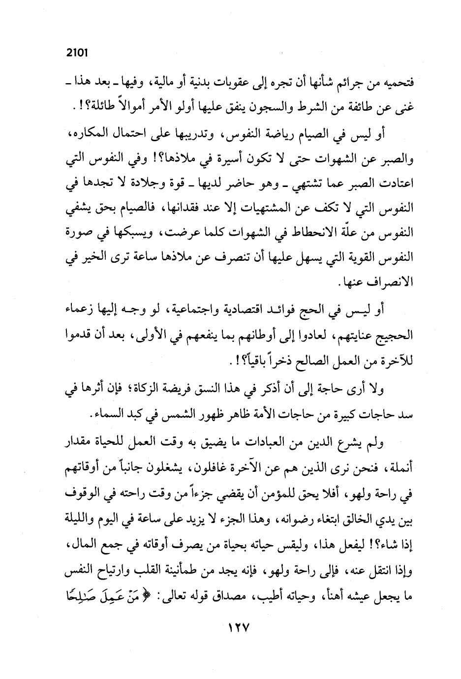 ولم يشرع الدين من العبادات ما يضيق به وقت العمل للحياة مقدار أنملة، فنحن نرى الذين هم عن الآخرة غافلون، يشغلون جانباً من أوقاتهم في راحة ولهو، أفلا يحق للمؤمن أن يقضي جزءاً من وقت راحته في الوقوف بين يدي الخالق ابتغاء رضوانه، وهذا الجزء لا يزيد على ساعة في اليوم والليلة إذا شاء؟! ليفعل هذا، وليقس حياته بحياة من يصرف أوقاته في جمع المال، وإذا انتقل عنه، فإلى راحة ولهو، فإنه يجد من طمأنينة القلب وارتياح النفس ما يجعل عيشه أهنأ، وحياته أطيب، مصداق قوله تعالى: {مَنْ عَمِلَ صَالِحًا