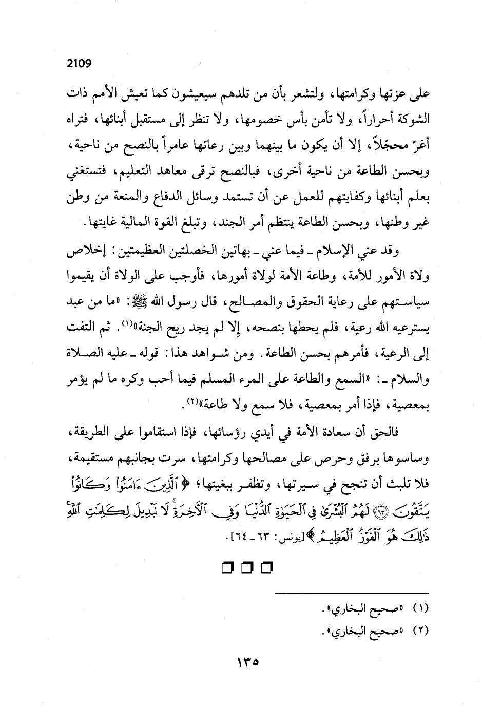 وقد عني الإسلام - فيما عني - بهاتين الخصلتين العظيمتين: إخلاص ولاة الأمور للأمة، وطاعة الأمة لولاة أمورها، فأوجب على الولاة أن يقيموا سياستهم على رعاية الحقوق والمصالح، قال رسول الله - صلى الله عليه وسلم -: "ما من عبد يسترعيه الله رعية، فلم يحطها بنصحه، إِلا لم يجد ريح الجنة" (¬1). ثم التفت إلى الرعية، فأمرهم بحسن الطاعة. ومن شواهد هذا: قوله- عليه الصلاة والسلام-: "السمع والطاعة على المرء المسلم فيما أحب وكره ما لم يؤمر بمعصية، فإذا أمر بمعصية، فلا سمع ولا طاعة" (¬2).