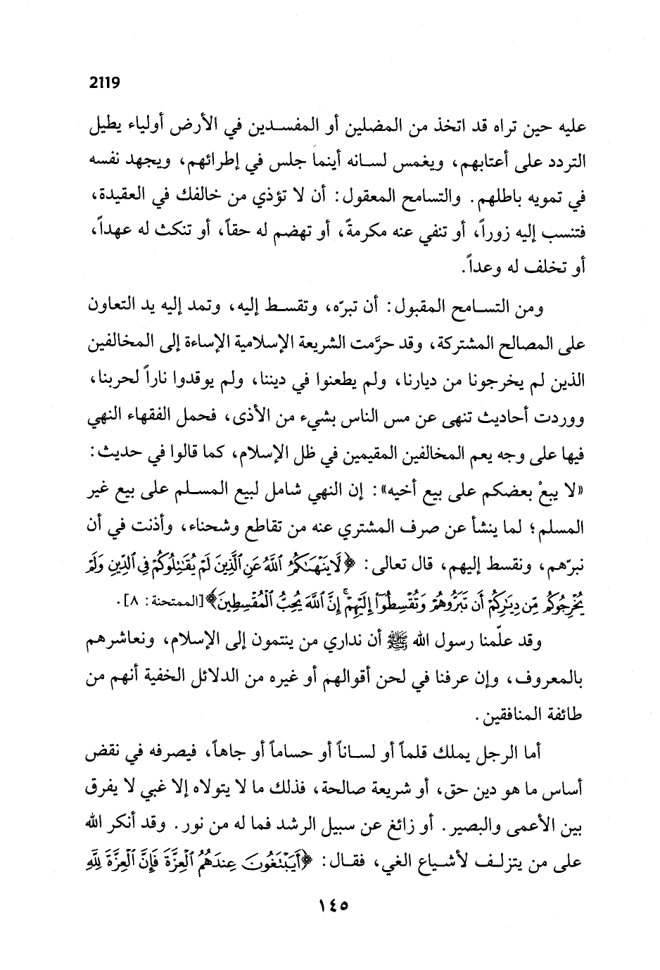 عليه حين تراه قد اتخذ من المضلين أو المفسدين في الأرض أولياء يطيل التردد على أعتابهم، ويغمس لسانه أينما جلس في إطرائهم، ويجهد نفسه في تمويه باطلهم. والتسامح المعقول: أن لا تؤذي من خالفك في العقيدة، فتنسب إليه زوراً، أو تنفي عنه مكرمةً، أو تهضم له حقاً، أو تنكث له عهداً، أو تخلف له وعداً.