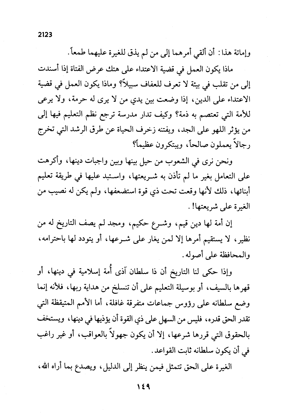 إن أمة لها دين قيم، وشرع حكيم، ومجد لم يصف التاريخ له من نظير، لا يستقيم أمرها إلا لمن يغار على شرعها، أو يتودد لها باحترامه، والمحافظة على أصوله.