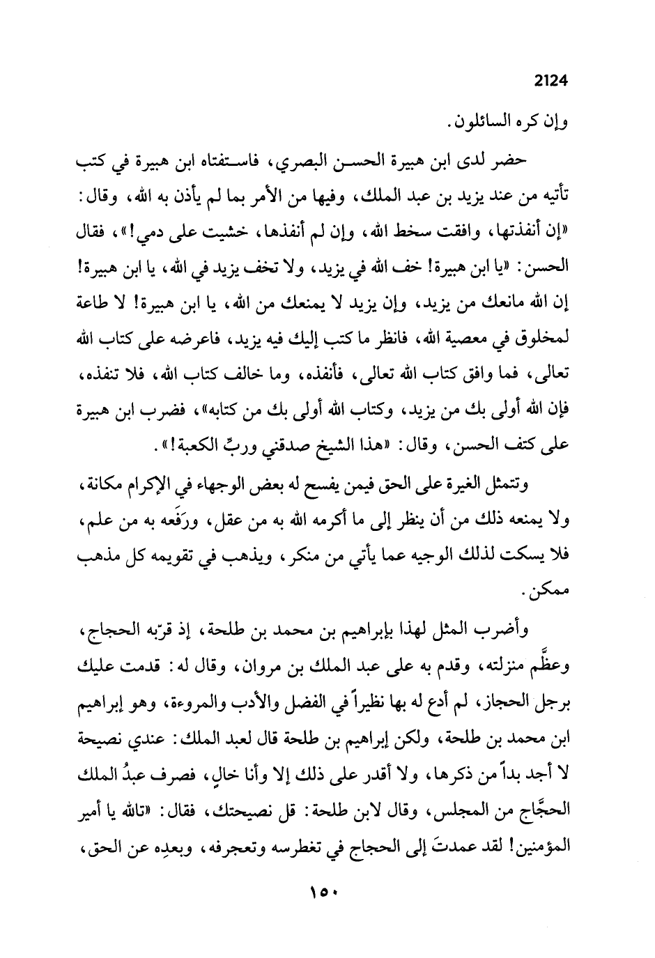 حضر لدى ابن هبيرة الحسن البصري، فاستفتاه ابن هبيرة في كتب تأتيه من عند يزيد بن عبد الملك، وفيها من الأمر بما لم يأذن به الله، وقال: "إن أنفذتها، وافقت سخط الله، صان لم أنفذها، خشيت على دمي! "، فقال الحسن: "يا ابن هبيرة! خف الله في يزيد، ولا تخف يزيد في الله، يا ابن هبيرة! إن الله مانعك من يزيد، صان يزيد لا يمنعك من الله، يا ابن هبيرة! لا طاعة لمخلوق في معصية الله، فانظر ما كتب إليك فيه يزيد، فاعرضه على كتاب الله تعالى، فما وافق كتاب الله تعالى، فأنفذه، وما خالف كتاب الله، فلا تنفذه، فإن الله أولى بك من يزيد، وكتاب الله أولى بك من كتابه"، فضرب ابن هبيرة على كتف الحسن، وقال: "هذا الشيخ صدقني وربِّ الكعبة! ".