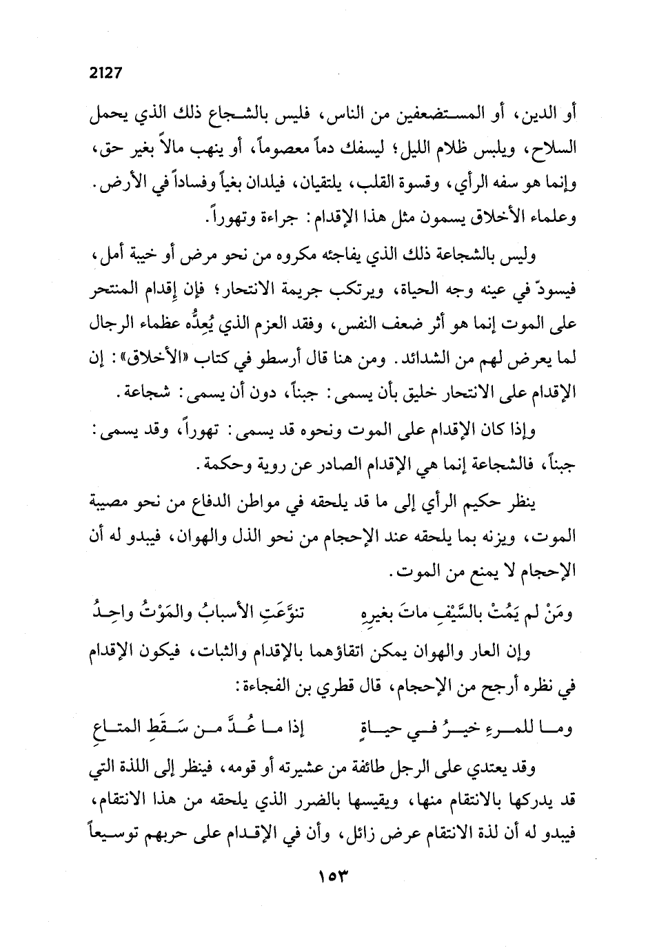 أو الدين، أو المستضعفين من الناس، فليس بالشجاع ذلك الذي يحمل السلاح، ويلبس ظلام الليل؛ ليسفك دماً معصوماً، أو ينهب مالاً بغير حق، وإنما هو سفه الرأي، وقسوة القلب، يلتقيان، فيلدان بغياً وفساداً في الأرض. وعلماء الأخلاق يسمون مثل هذا الإقدام: جراءة وتهوراً.